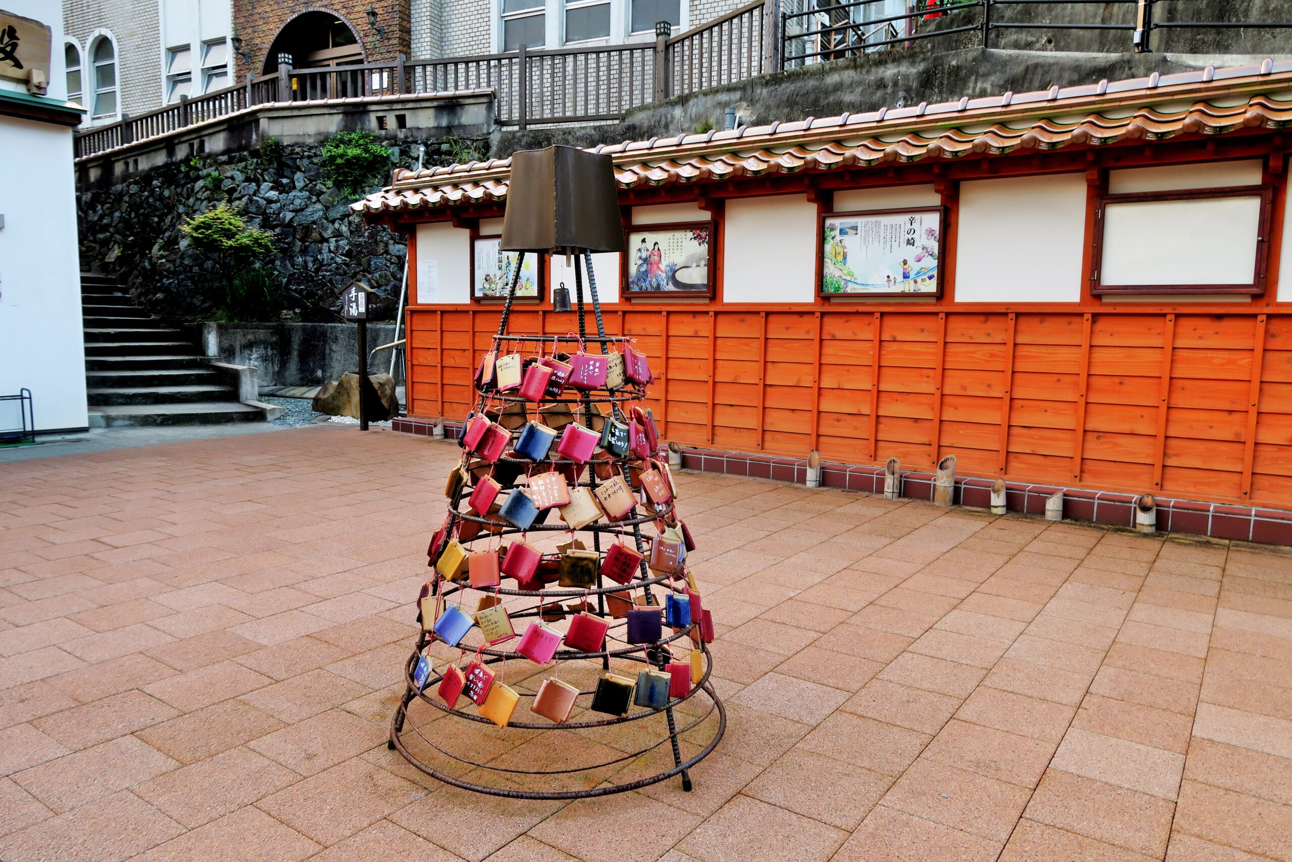 坂道や路地裏に細い階段が張り巡らされた温泉街にはところどころに広場や踊り場のようなところがあります。湯の町神楽殿前の広場には、石見地方の特産品である色とりどりの石州瓦を使った絵馬に願いを込めて結う「瓦ぬご縁結所」があります。瓦の色は6種類で、赤は愛情、青は慈愛。黄色は友情というようにそれぞれ意味があるのでどんな縁を深めたいかで選びます。