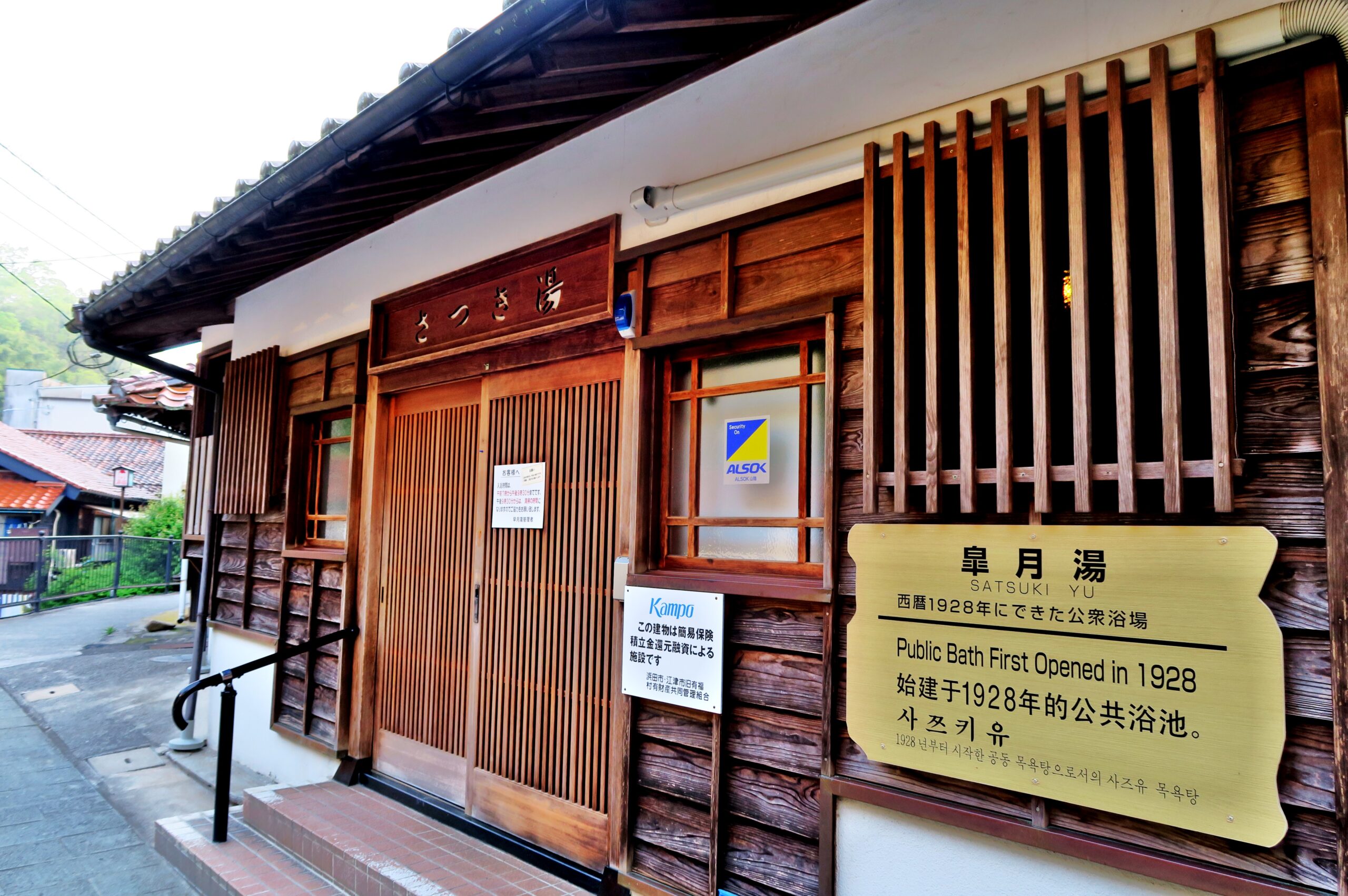 少し下に建つ江戸末期築の木造の三階建ての旅館「三階旅館」は元はお殿様が湯治の際に泊まっていたとのことで、その隣にあるのが平成3年(1991)に改築された木造平屋の共同浴場「さつき湯」です。木造の小さくてレトロなお家のようなかわいい外湯です。家庭的な雰囲気があり、木の香りと少しぬるめの湯でリラックスできます。地元客の利用が多いといいます。
