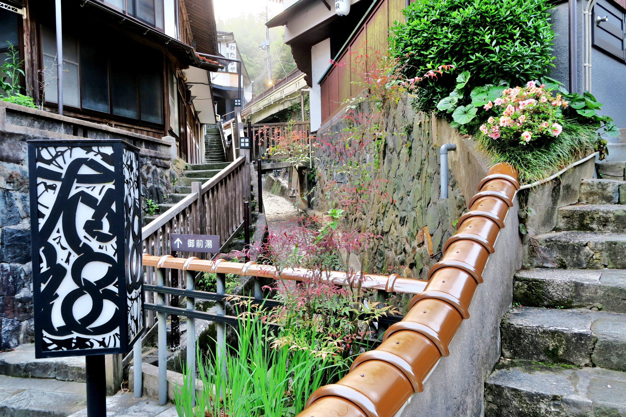 時代を感じさせる細い石段は有福温泉の象徴。街の真中は雛壇状にぎゅっと旅館や民家が集まっているので、この石段を何度も行き来します。また石畳の階段の分岐には「福灯り」という『福』の文字が書かれた行灯が設置されています。階段を上る前に福のご縁を願いながら行灯を回し、福の字が止まった側の階段が、願うご縁に向かう「福の道しるべ」なのです。