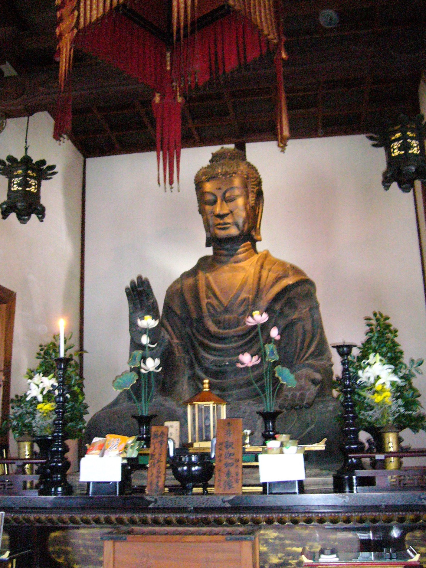 本尊である銅造釈迦如来坐像(重文)は「飛鳥大仏」の通称で親しまれており、609年推古天皇が仏師・鞍作鳥に造らせたとされる日本最古の仏像です。アーモンド型の眼やアルカイックスマイルといった大陸風の凛々しいお顔立ちが特徴です。 仏像よりお堂が先に完成し、入口より大きい仏像を入れるという不可能なことを、止利の秘技で入口を壊さず、その日のうちに納めたという逸話もあります。1400年もの間、この地で飛鳥を見守ってきた大仏様です。