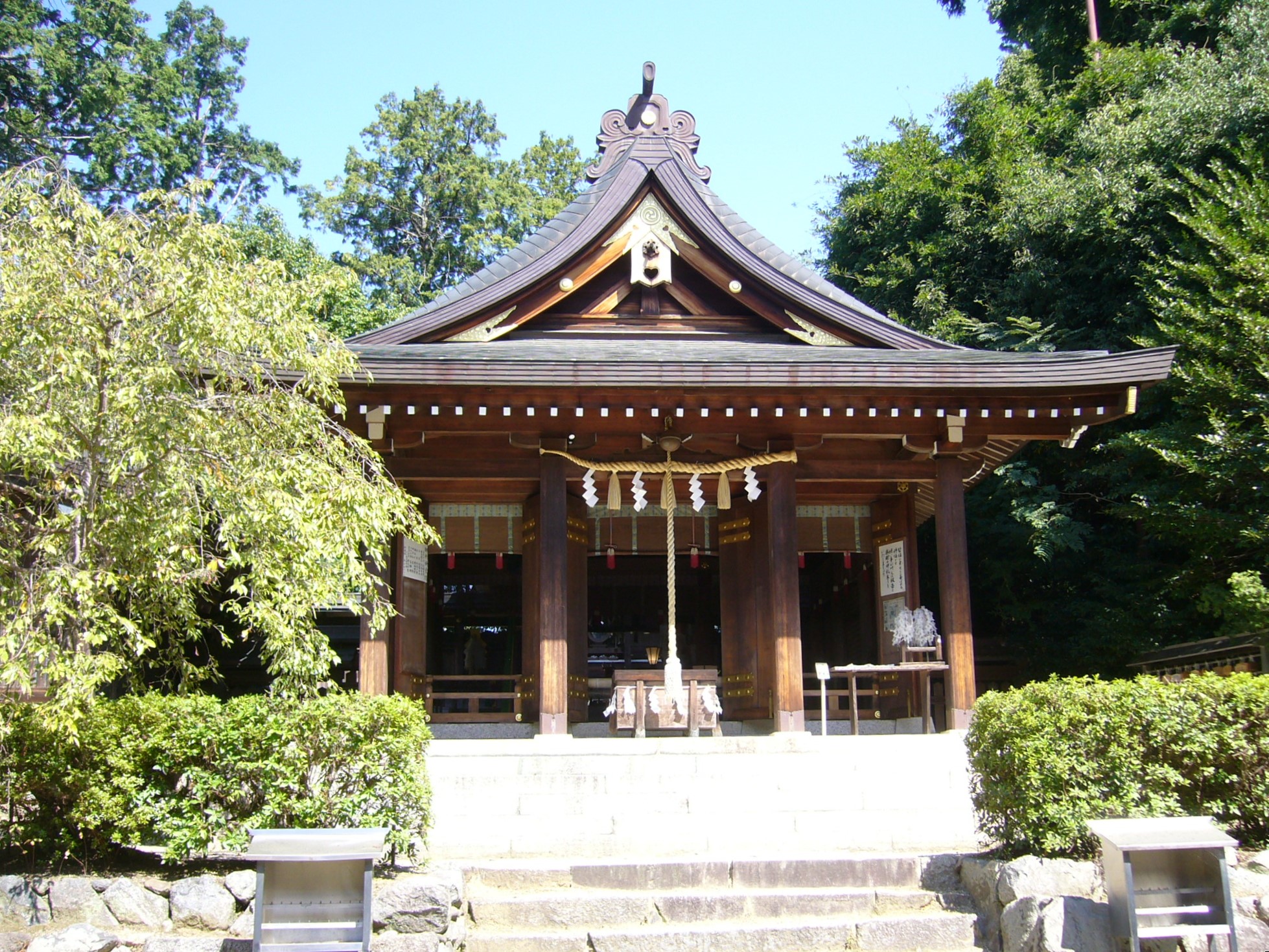さらに北上して突き当たりを右に曲がるとその突き当たりが「飛鳥坐神社」で、段を上った先、小高い丘の上に本殿があります。大国主命の第一子で八十万の神々を率いて飛鳥に鎮まったと『古事記』に記されているパワフルな神様、八重事代主神を祀る古社で、日本書紀に朱鳥元年(686)に天武天皇の病気平癒を願って奉幣がなされた記述がある。飛鳥浄御原宮の守護神として奉祀されていたが神託を受け、天長6年(829)神奈備山から現在地に移転しました。この神様に縁結びをお願いすると、その八十万の神々の中から祈願者に最もふさわしい守護神を選んでくださり、良縁を授けていただけるとか。ちなみに延喜式内の古社で、崇神天皇の時代から一族でこの神社の宮司を受け継ぐ家系の名字は「飛鳥」さんです。