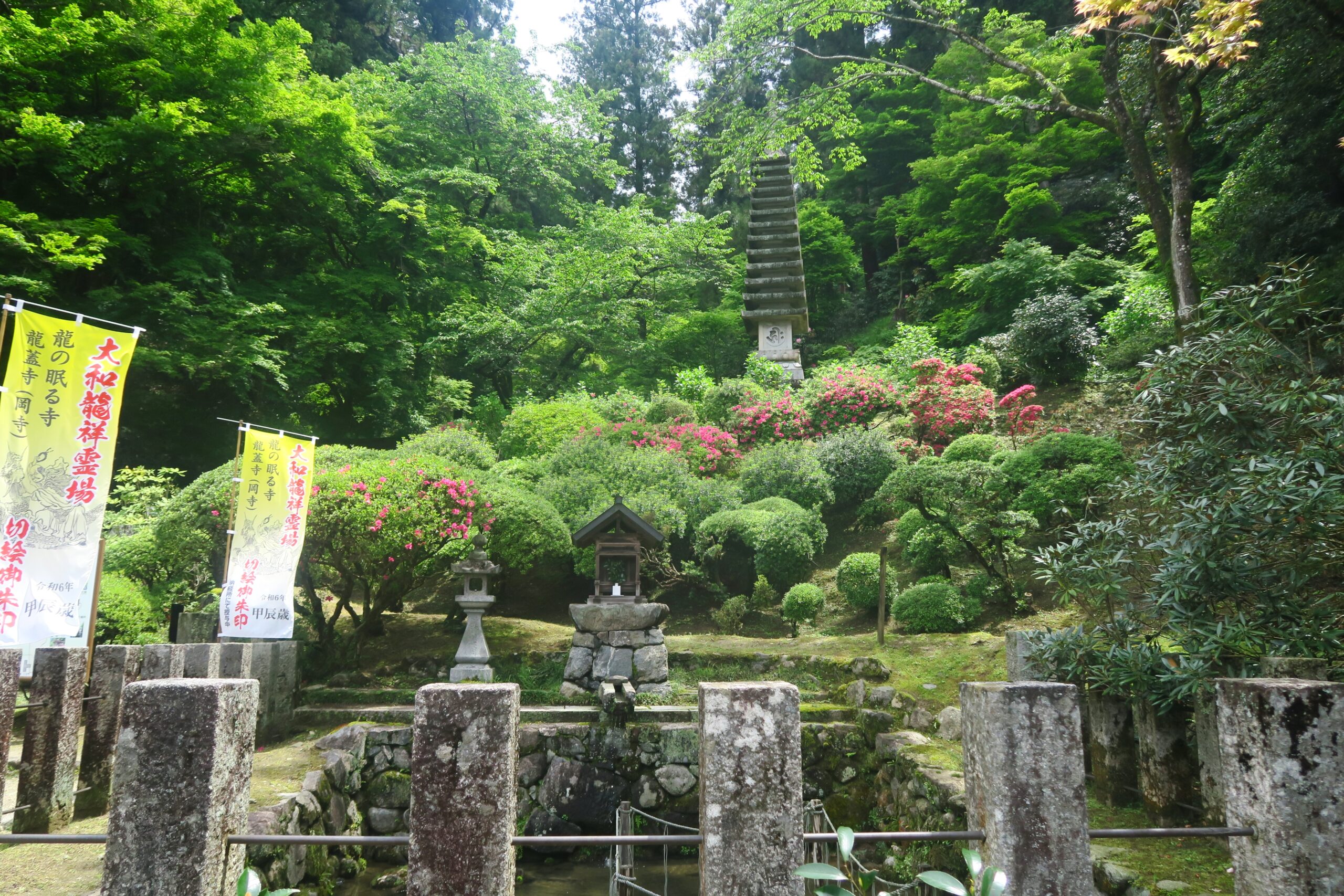 境内の龍蓋池を望みながら奥の院へ。稲荷神社の右手、山の斜面に奥の院があり、弥勒菩薩が坐す洞窟や義淵僧正霊廟を拝し、三重宝塔から飛鳥の里景色を望むます。