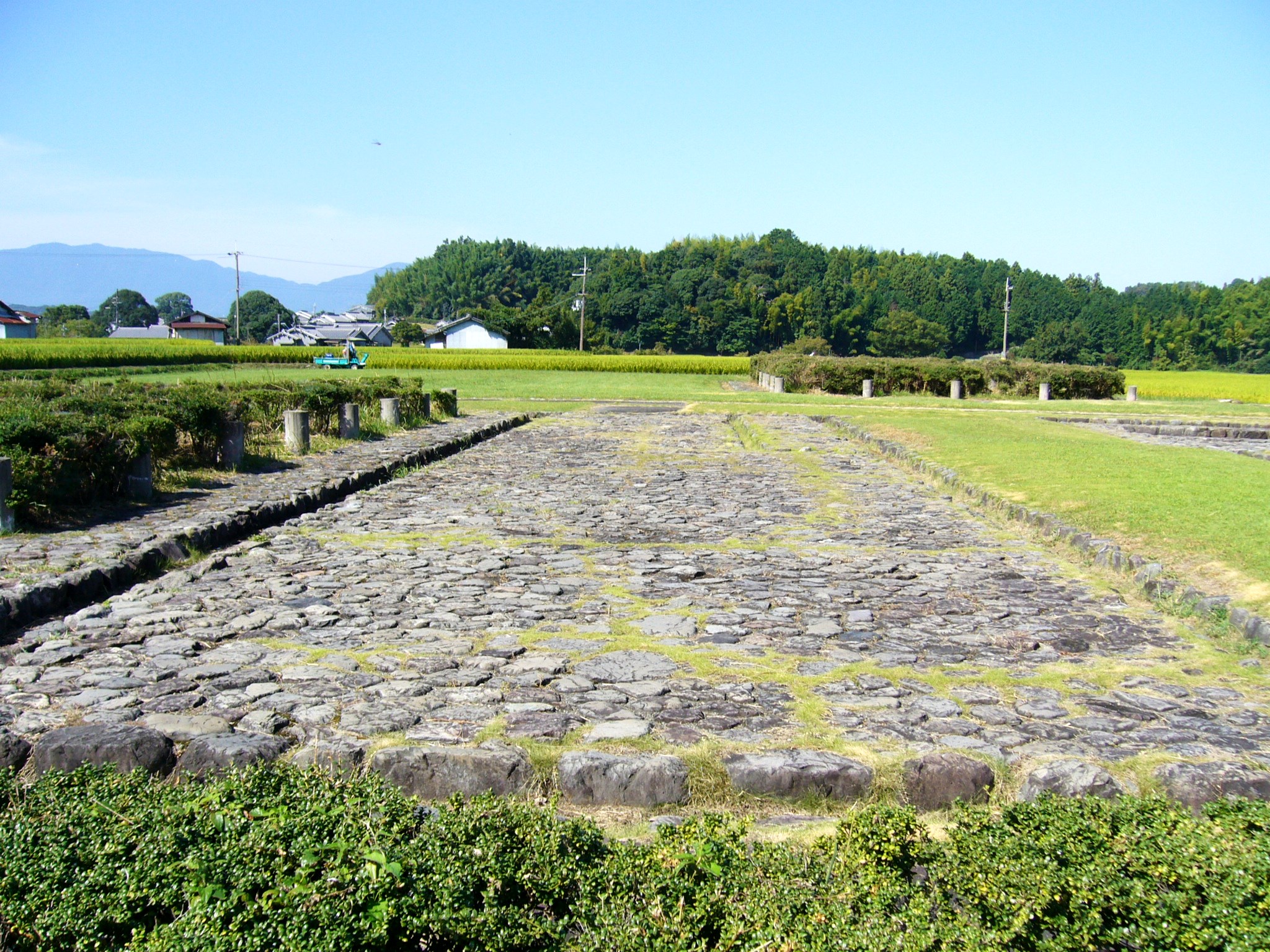 県道15号に戻り、2km程静かな通りを快適に走り、明日香村役場の北、小さな丘陵に囲まれた平地にポツンとある蘇我馬子邸に隣接していた皇極天皇宮殿跡「伝飛鳥板蓋宮跡」を訪れます。大化元年(645)6月12日、高句麗、百済、新羅からの使者が天皇への貢物を捧げる華やかな外交儀式が執り行われていた宮殿で起きたクーデター“乙巳の変”、皇極天皇の目前で、中大兄皇子と中臣鎌足が蘇我入鹿を斬殺した舞台です。この時、中大兄皇子20歳、中臣鎌足32歳でした。