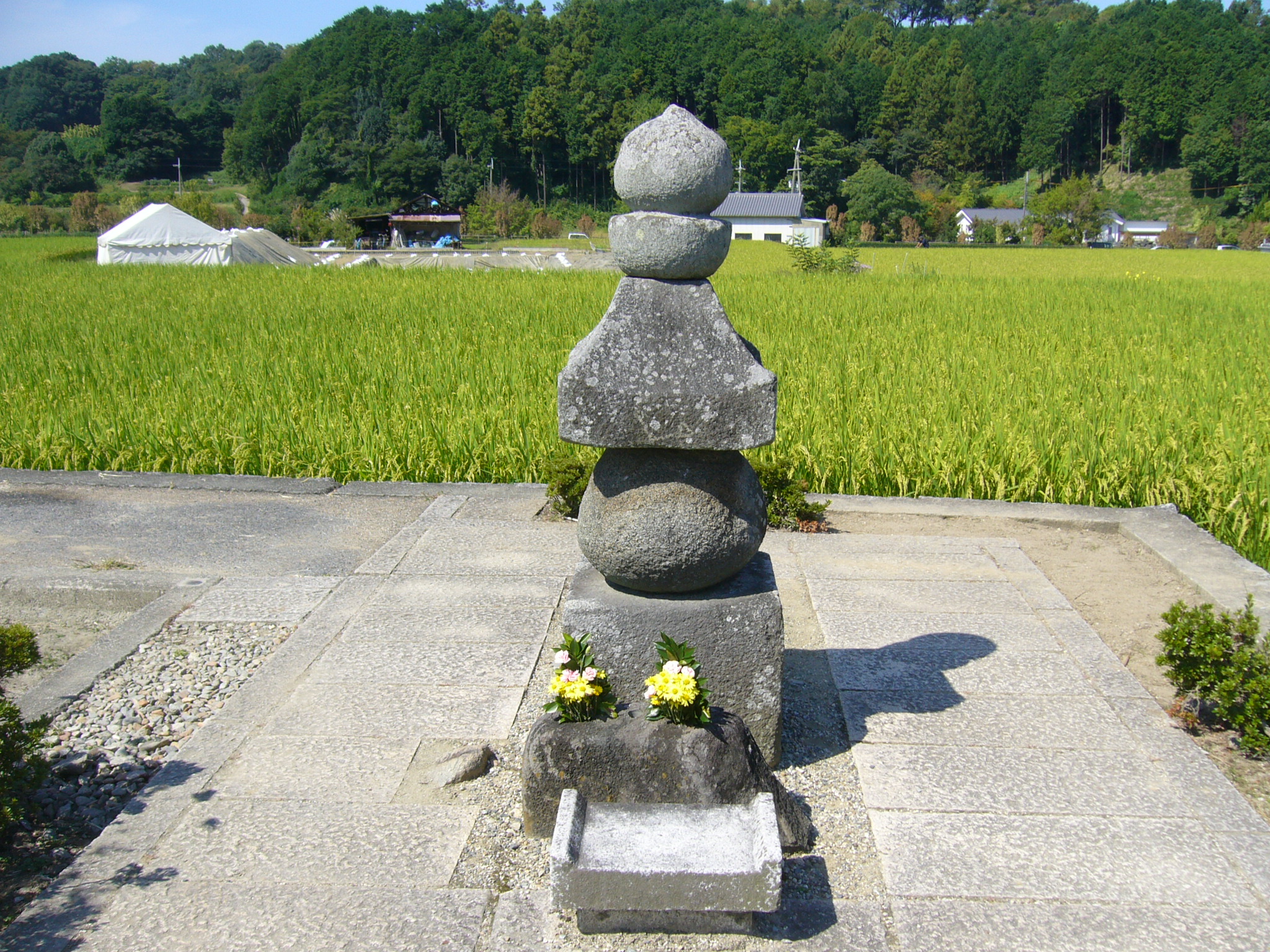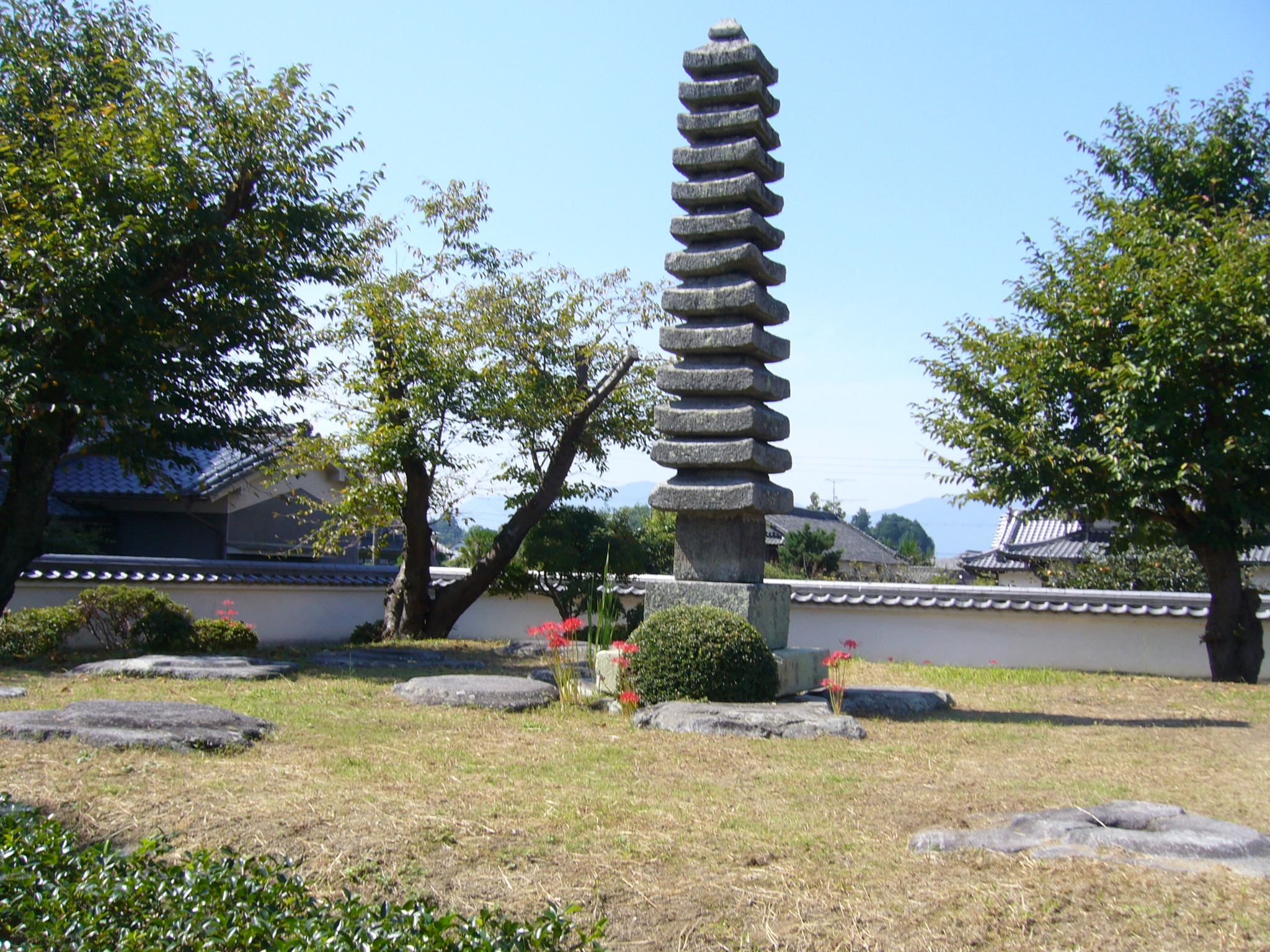 次に明日香村に戻り、まずは「奥山久米寺跡」に。民家の間のつつましい佇まいで聖徳太子の弟久米皇子の創建といわれますが謎とのことです。蓮華文様をつけた現存最古の鬼瓦をはじめ、7世紀の瓦が多数出土している。塔跡が残り、心礎の上に鎌倉時代の十三重石塔が建っています。