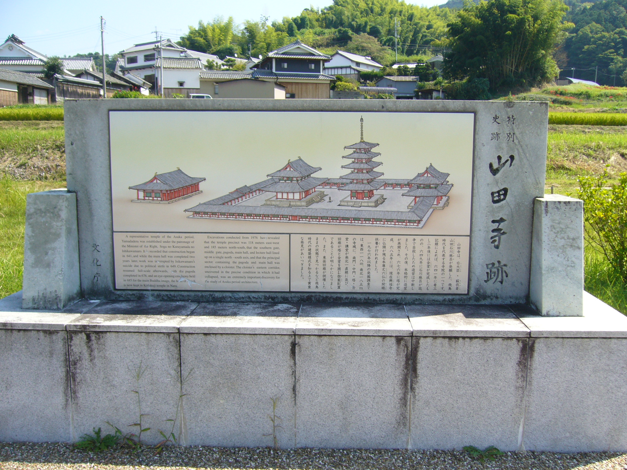まずは県道15号を北へ、県道124号との奥山交差点を桜井方面に向かい「山田寺跡」に向かいます。蘇我倉山田石川麻呂が641年に発願した山田寺は、飛鳥時代を代表する初期仏教寺院の一つです。649年の石川麻呂の死去により造営は中断された後、石川麻呂の孫の鵜野皇女(後の持統天皇)の援助によって再開されました。山田寺跡にも今も建物の基壇や礎石が残っています。昭和51年(1976)以降の発掘調査によって、山田寺は東西118m、南北185mもの大寺院であったこと、また、南門・中門・塔・金堂・講堂が南北一直線に並び、回廊が塔と金堂を囲む伽藍配置であったことが明らかになっています。685年に開眼供養が行われた本尊の丈六薬師仏は、平安時代の日記『玉葉』によると文治3年(1187)に興福寺東金堂の宗徒が押し入り本尊として迎えられましたが、応永18年(1411)の東金堂の火事で焼け落ち、残った仏頭が現在の興福寺に現存します。