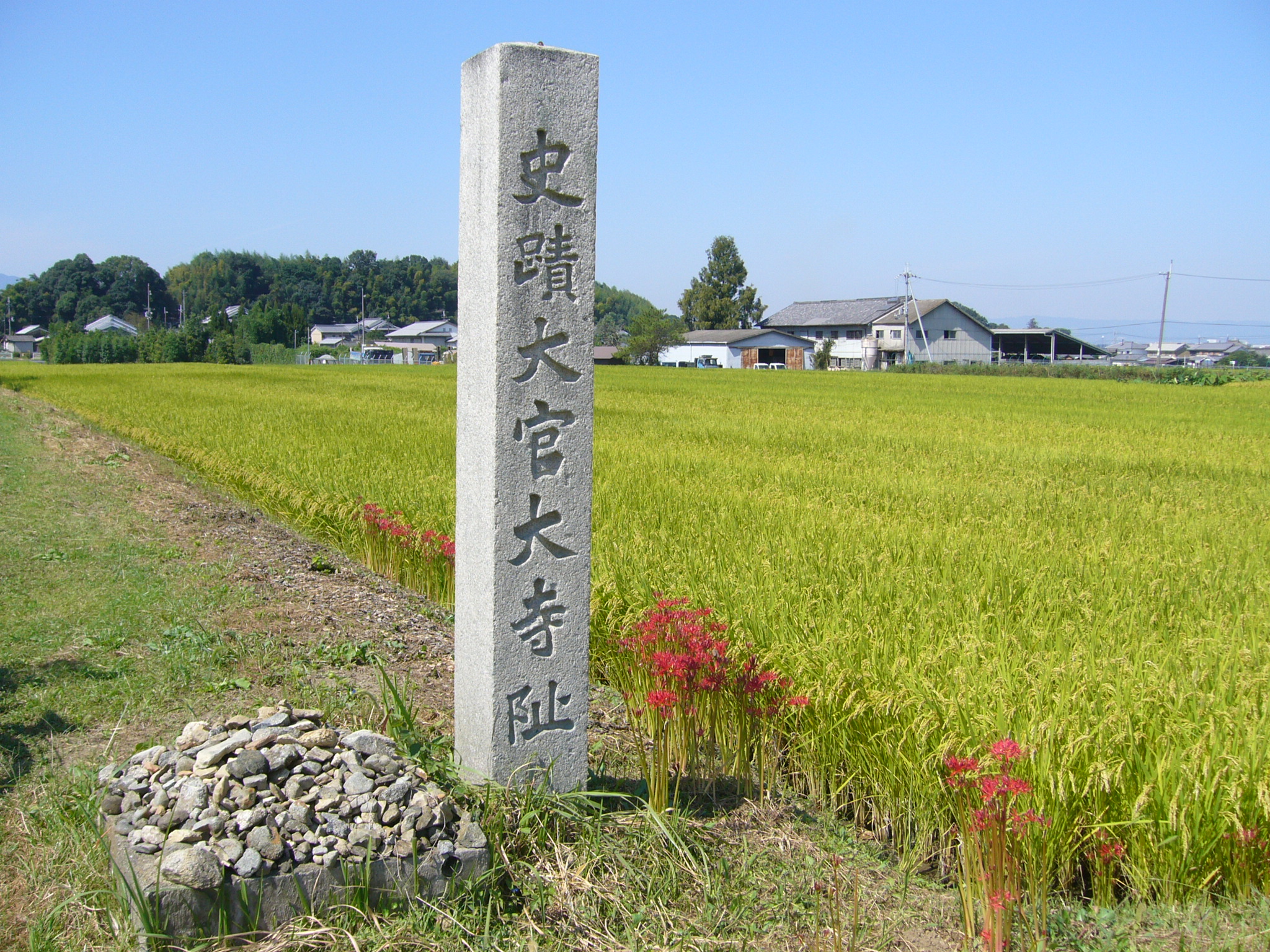 近くに「大官大寺跡」もあります。大官大寺は飛鳥・藤原地域で建立された古代寺院の中では最大の寺院なのですが、現在は、香具山の南麓に広がる水田の中に碑が建ちその位置が分かるのみです。大官大寺は、日本書紀によると、聖徳太子によって平群に創建された「熊凝精舎」を、舒明天皇が百済川畔に移し、「百済大寺」といい、次いで天武天皇は天武2年(673)に、この飛鳥の地に移し「高市大寺」といったが、同6年(677)、天皇の寺という意味の「大官大寺」と改称したとあります。