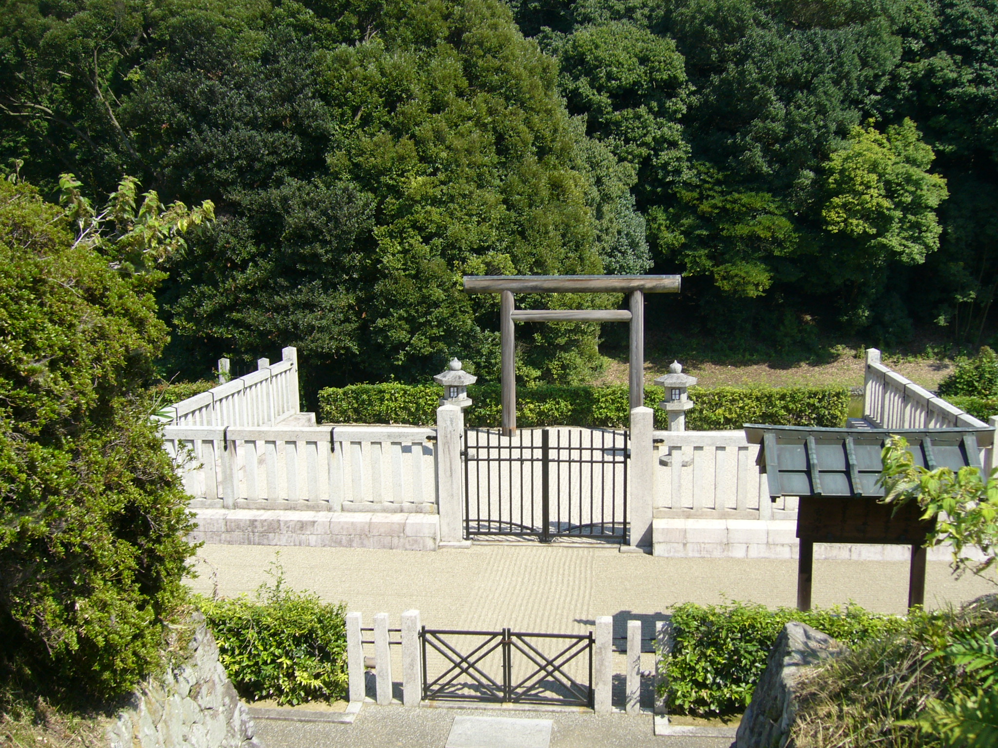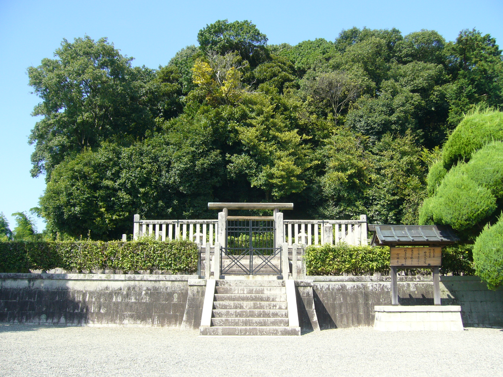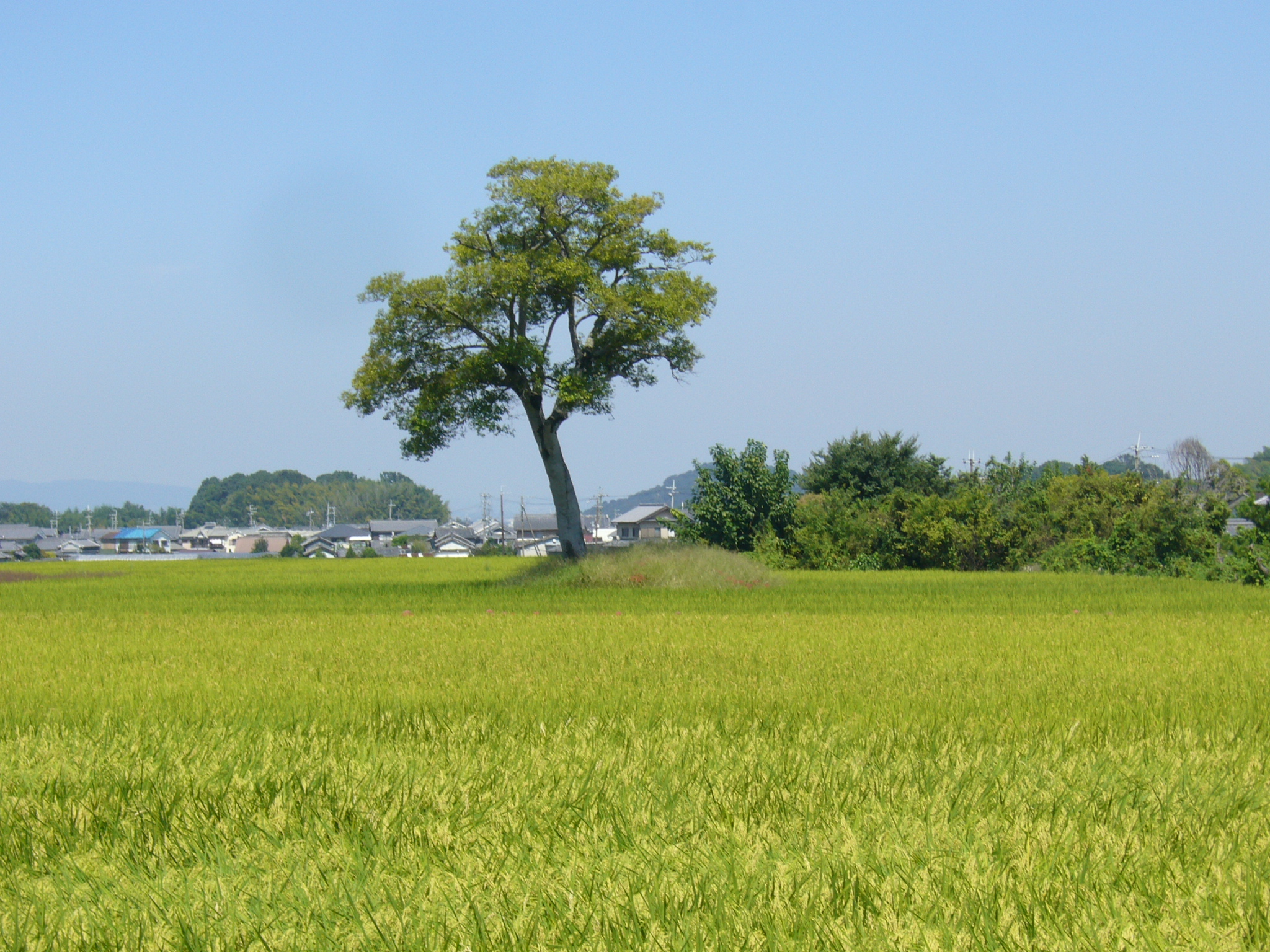 もとの道に戻って「鬼の雪隠」と少し上った所にある「鬼の俎板」と呼ばれるこれもまた不思議な石造物を見、ここからサイクリングにも最適な田畑に囲まれた飛鳥周遊歩道を走りさらに下って行きます。そのつきあたりが最後に向かう「欽明天皇稜」です。全長140m、明日香村内最大の前方後円墳で墳丘の緑と濠が美しい「欽明天皇稜」は、570年に死去した欽明天皇と、后で蘇我馬子の妹の堅塩姫を合葬した檜隈坂合陵とされています。