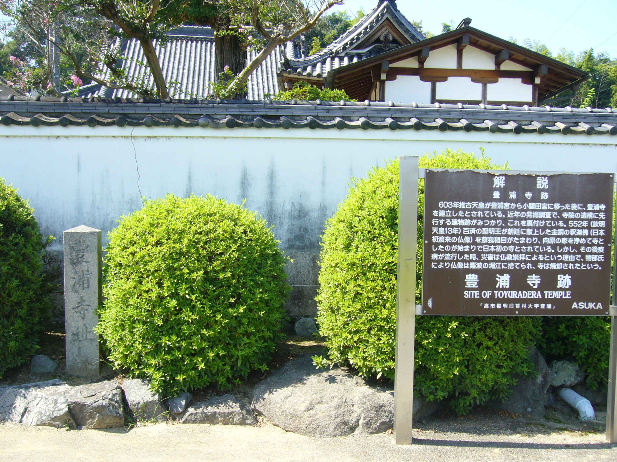 日本最初の女帝である推古天皇は592年に即位しますが、崇峻天皇暗殺から間もない時であったため、新たに大規模な宮殿を築かなかったとする考えがあり、それが蘇我氏の邸宅の一部を転用した豊浦宮と考えられており飛鳥時代の幕開けとされ、宮殿跡の石敷が保存されています。その後推古天皇11年(603)10月、推古天皇は「小墾田宮」に宮を遷しました。現在甘樫丘近くに建つ向原寺は、豊浦宮跡地に蘇我馬子が、法興寺(飛鳥寺)の妹寺を建てたのが「豊浦寺」です。桜井道場あるいは桜井寺とも呼ばれた日本最古の尼寺で、百済仏教伝来の寺、元善光寺です。豊浦の地が蘇我氏の勢力圏内であったことはよく知られており、蘇我氏の基礎を築いたとされる蘇我稲目はこの地に邸宅を持っていました。