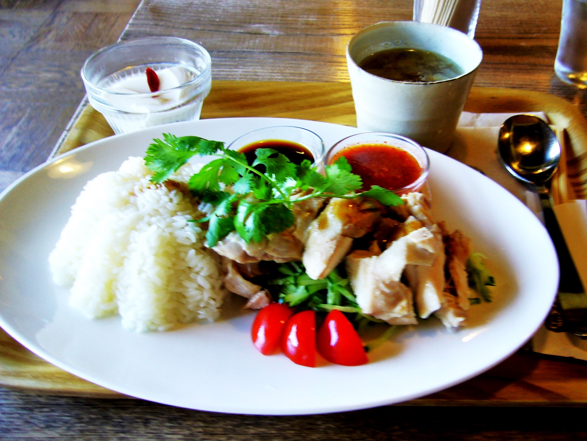 おすすめは、お昼のランチの「海南鶏飯(1000円)」です。ハイナンチキンライスとも呼びますが、その昔、中国の海南島の人たちがマレーシアに移り住んで考え出した料理だと言われ、現在マレーシアのソウルフードということです。お皿に御飯と蒸鶏ときゅうりとミニトマトが盛られていて、これにチリソースと生姜醤油をかけ、混ぜて食べるとのことで綺麗な盛り付けを壊すビビンバのようなものですが、これが絶品です。(店主の奥さまがマレーシア人とのこと)