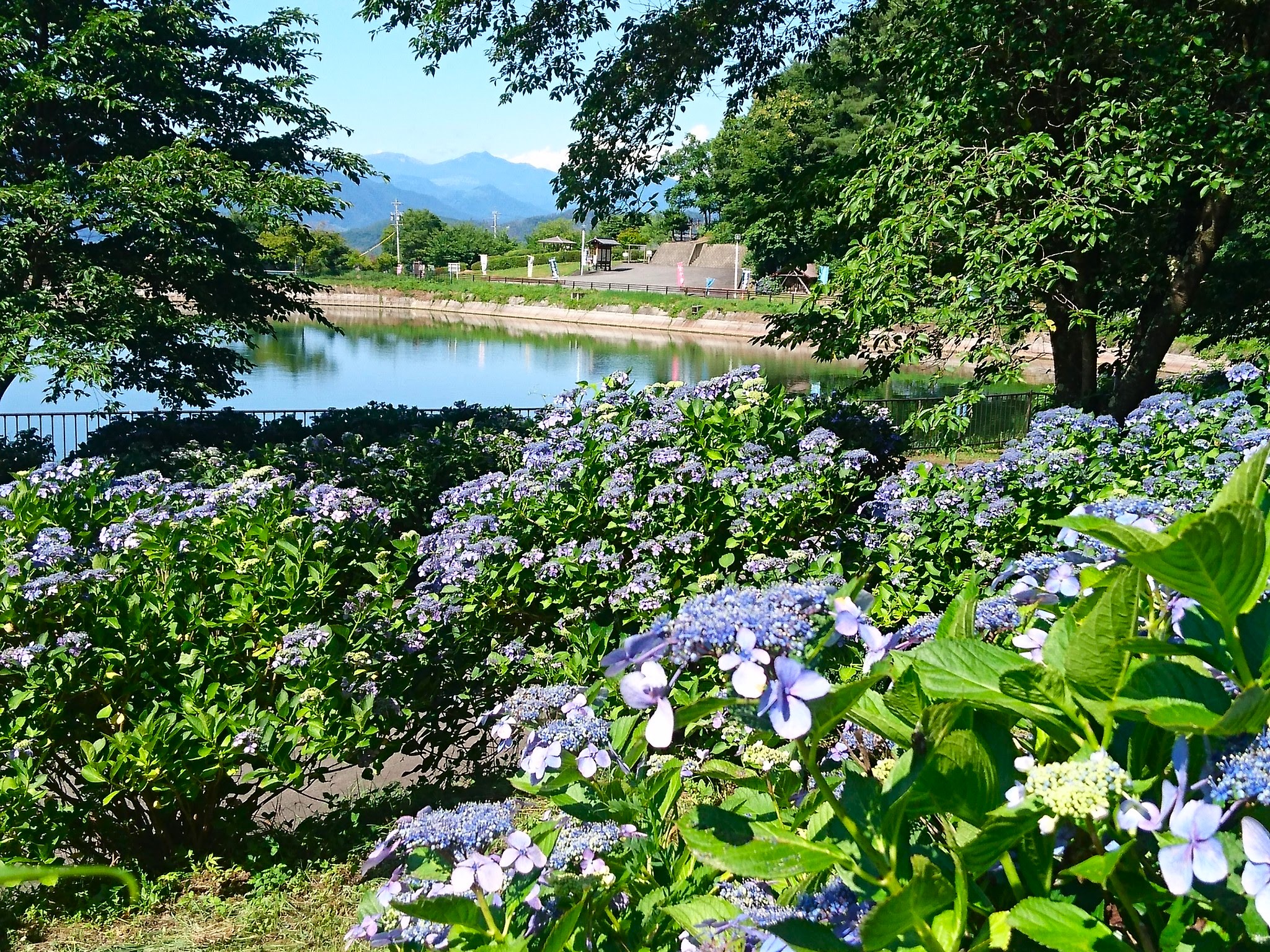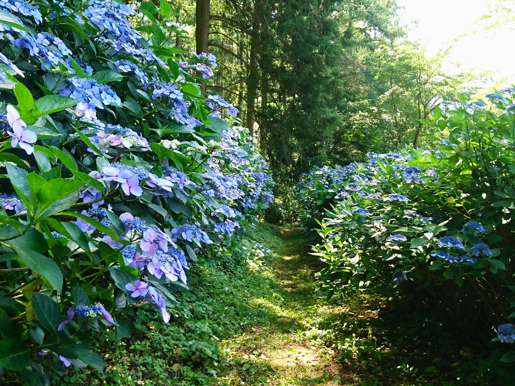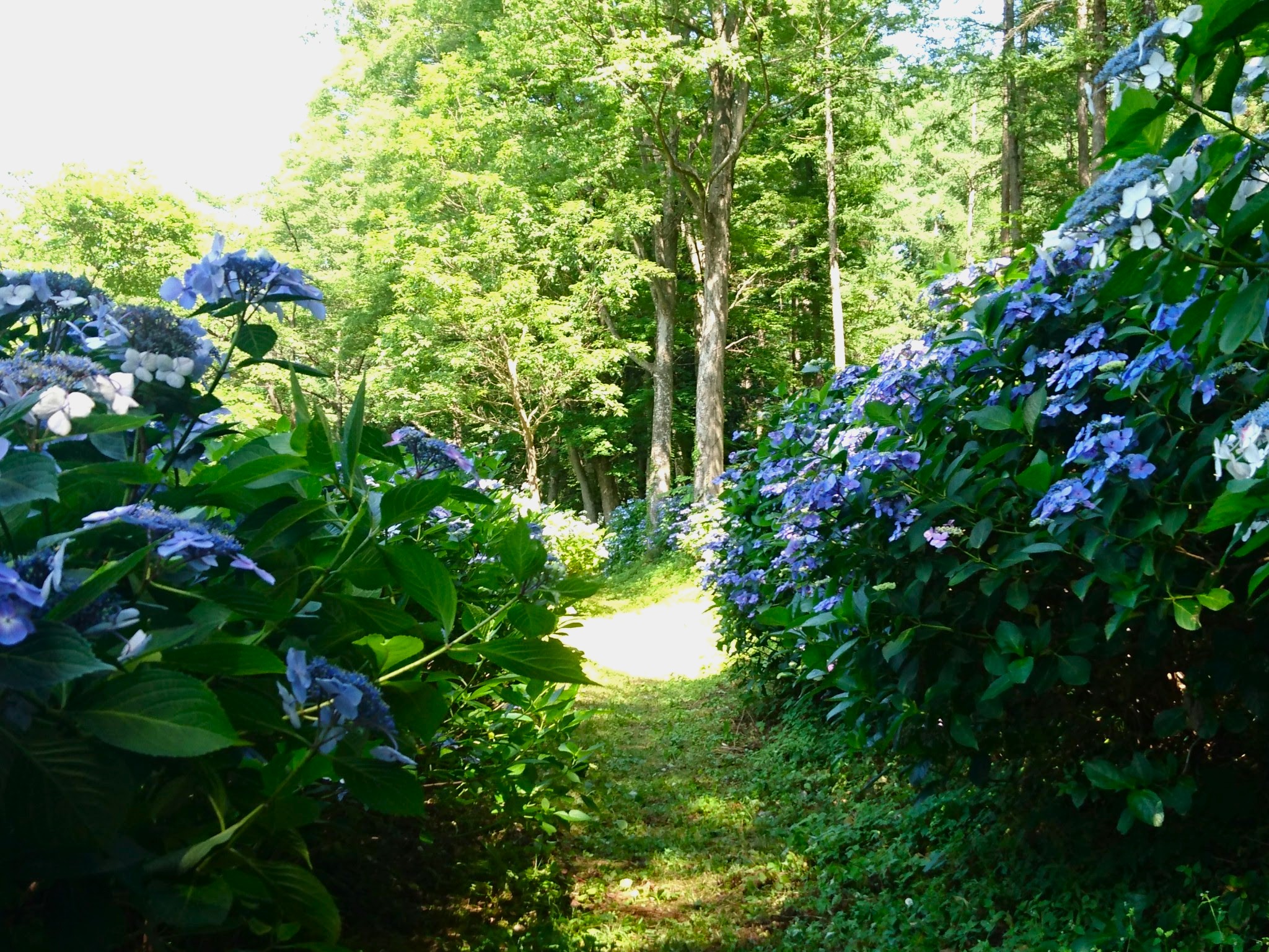 ここから先は「塩田の館」まで、両脇を埋め尽くすあじさいと木漏れ日がまぶしい道のりが続いてゆきます。