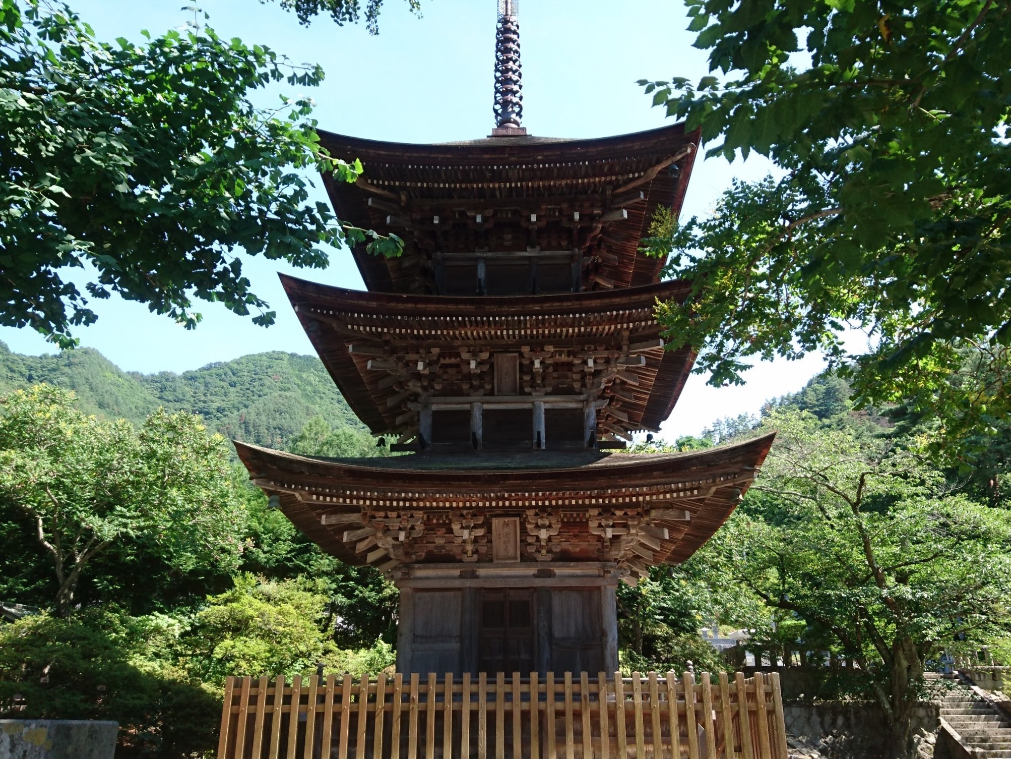 茅葺きの本堂と三重塔が印象的な真言宗の寺院で、特に重要文化財である三重塔は室町時代初期の建立です。塔は三間三重で、高さ19・5m、屋根は杮葺で和洋と唐様の調和が見事です。当時の様式である二、三層に本来あるべき廻廊、勾欄や窓がないため、その美しさから完成物以上に均整のとれた佇まいに「未完成の完成塔」と呼ばれています。