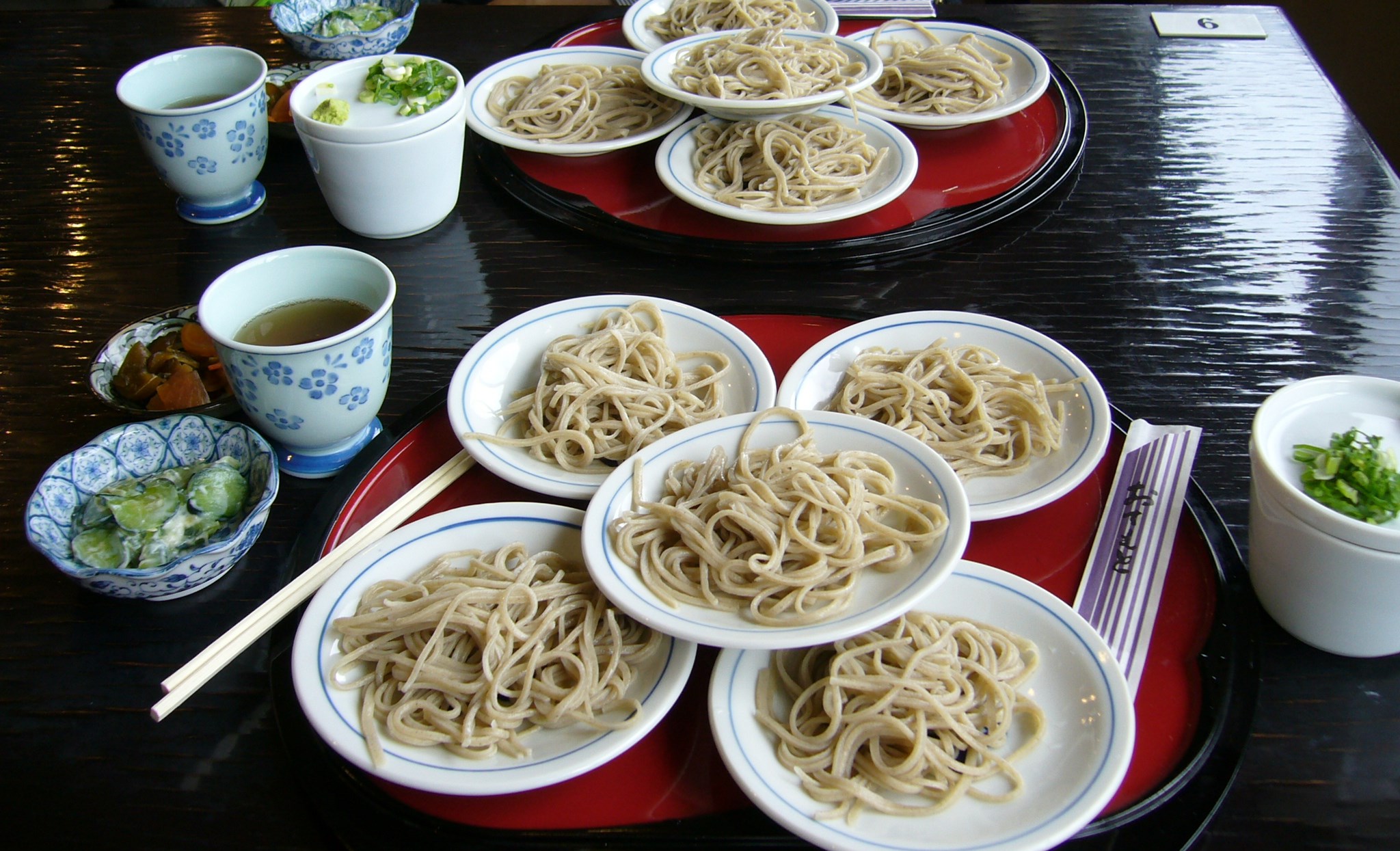 切盛りするのは西塩田地区営農活性化推進組合女性部のおば様方。開店の2年前から地元上田の名店「おお西」で手打ちそばの研修を受け、腕を磨いたそうです。地元塩田で収穫されたそばを石臼で丹念に製粉、提供する日の朝に手打ちをし、挽きたて、打ちたて、ゆでたての3たてにこだわっているとのこと。そばは出石そば同様、白い出石焼きの5枚の小皿に盛られて供されます。5枚で1人前700円、小皿1枚追加は120円、15皿食べればそば通の証、もれなく記念品(真田十勇士か上田城のタオル)が頂けるとの事。そば栽培から製粉、手打ち、店の運営まで一貫して同組合で管理するこだわりの蕎麦は、さすがに味、香り、食感どれをとっても美味しい蕎麦です。