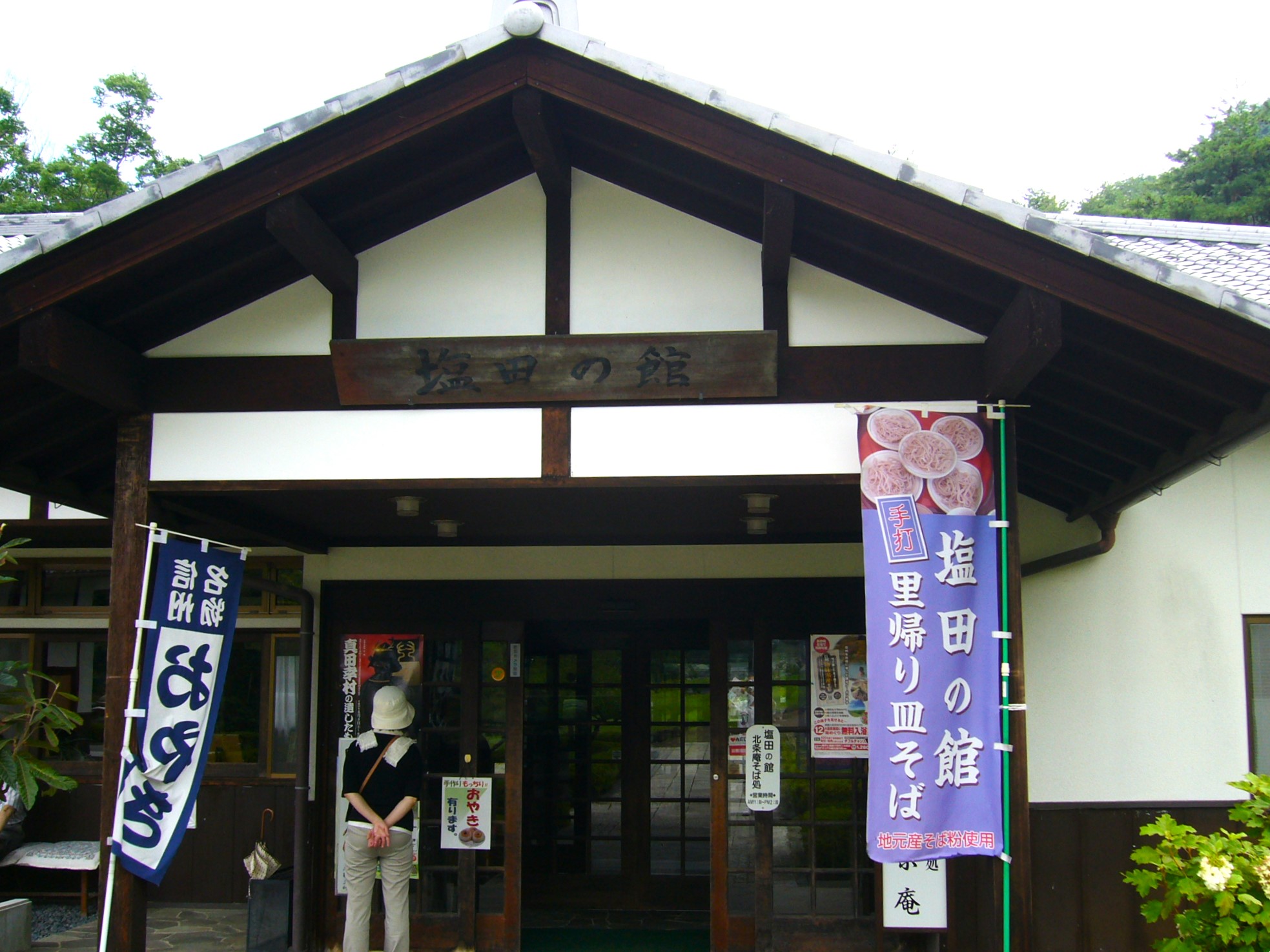 歩き始めて20分、観光センター「塩田の館」で休憩。“蚕都上田”をイメージし、かつてこの地に多かった白壁黒瓦の養蚕農家を模した建物で、塩田城跡からの出土品を展示しています。ここには「そば処北条庵」が併設されています。