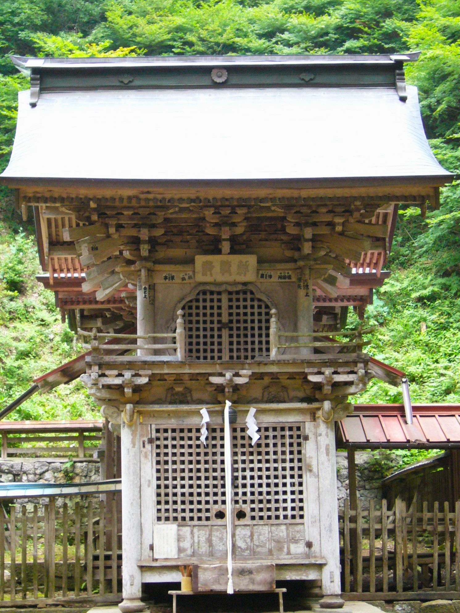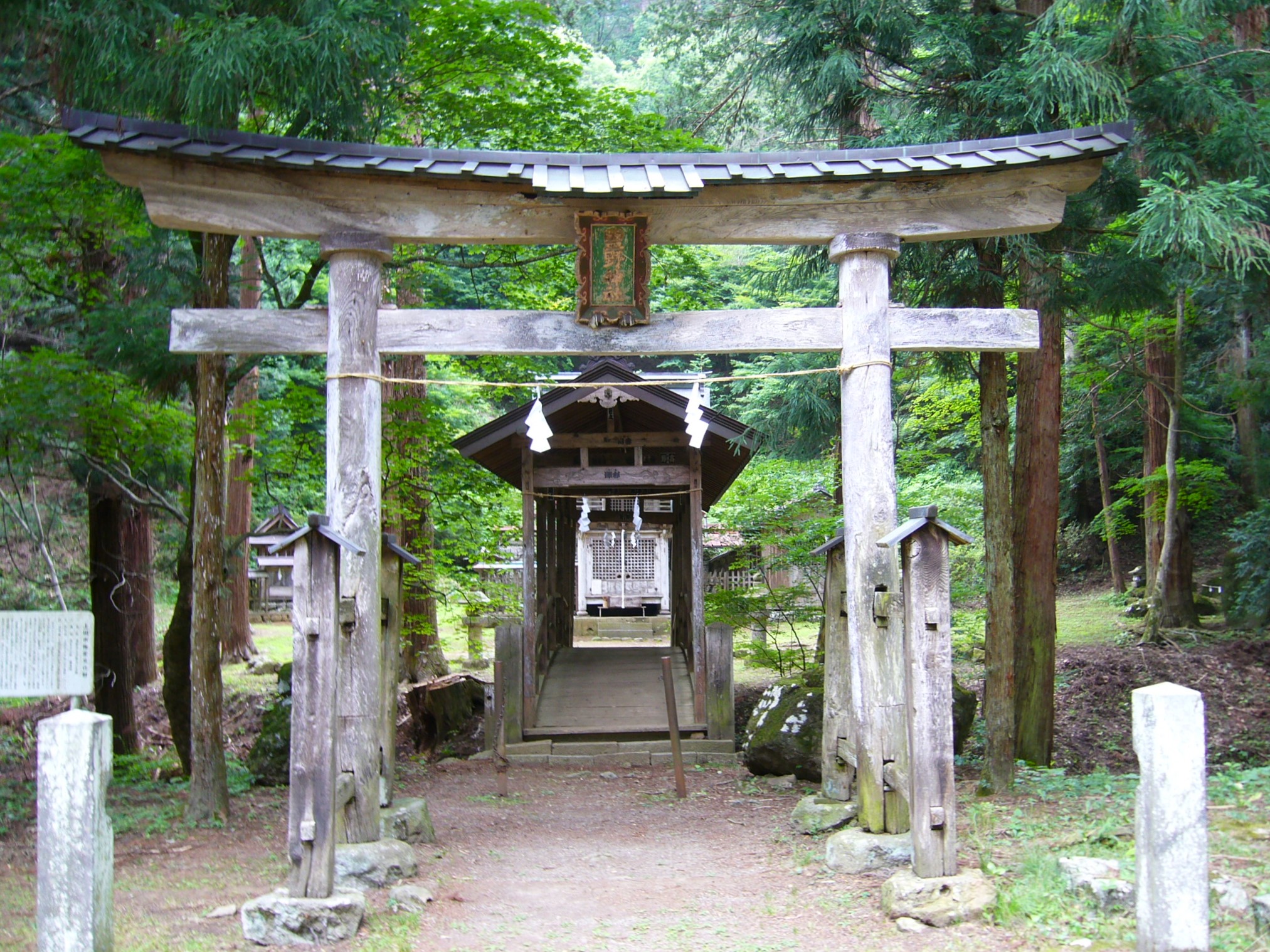 拝殿は寛保3(1743)年に現在の地に再建されました。間口と奥行きが同じ長さの楼門造りの二階建てで信州ではとても珍しく、建築形式上でも貴重な建物と言われています。寛延3年(1750)に建てられた拝殿後ろの本殿は神社建築様式のひとつである一間社流れ造りで、やはり間口と奥行きの長さがほぼ同じ。庇が正面の階段の上に張り出すように向拝がついている。