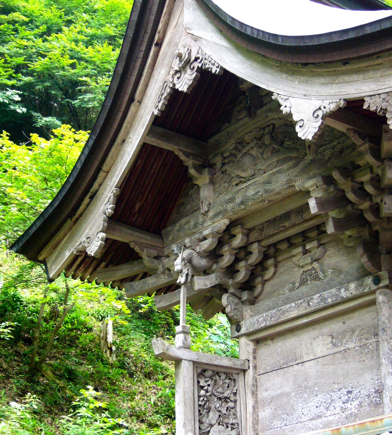 とりわけ拝殿の彫刻の緻密さと豪快さには惹かれるものがあります。虎や牡丹、天女、また昇り龍、下り龍の透かし彫り、虹梁と呼ばれる装飾のある梁には象や雲形が刻まれるなどすべてが完成された美しさです。また三手先の肘木の力強さは、すっと背を高くして立つ拝殿が一層逞しく見える。竜が脇障子の上の木を飲み込む珍しいデザインで竜の目玉がないのは、夜ごと悪さをする竜の目玉をくりぬいたからという伝説が残っています。戦国耳朶には武田信玄や真田昌幸、信之父子らも信仰を寄せています。