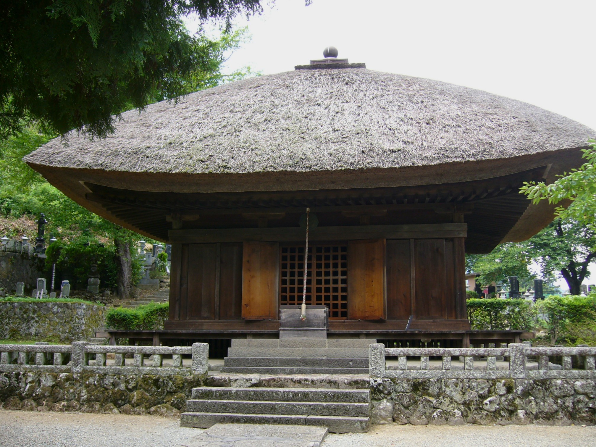中部日本最古の木造建築物と言われる薬師堂が素晴らしく、東西南北のどちらから見ても柱が4本立ち、柱と柱の間が3つある。茅葺き屋根のてっぺんには、少し先の尖った宝珠や、その下には四角な露盤とよばれる台を乗せてある宝形作り。「方三間 宝形作り」という平安末から鎌倉初期にかけての様式で、そして扉は、正面に3ヵ所、残りの3方に1カ所ずつあり、板を貼った板壁なのが見て取れます。平泉中尊寺の金色堂と同様の「方三間の阿弥陀堂形式」を伝えていて、阿弥陀如来堂様式の典型と言われている。素朴な風情を醸し出している茅葺き屋根は、上からは真四角に見えるらしい。