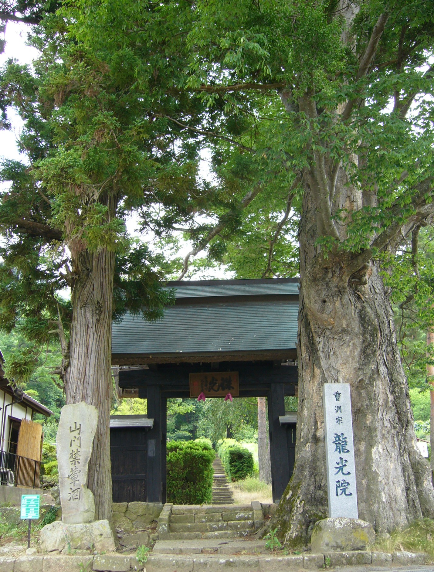 古くは仙乗寺といい鎌倉・建長寺の末寺でしたが慶長6年(1601)萬照寺6世瑞応が中興開山し、龍光院と改め萬照寺の末寺となった曹洞宗のお寺です。黒門と樹齢600年を誇る欅の古木が堂々たる風格を感じさせます。ところで、この寺では事前予約制で精進料理「山菜膳」が食べられるとのことです。