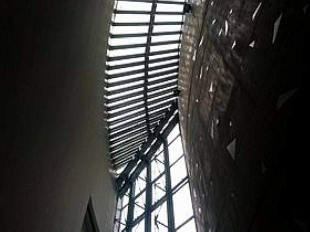 エントランスホールは土蔵をイメージするかのようにスーッと立ちあがったコンクリート打ちっ放しの流れるような湾曲した壁面と、晴れていれば光を反射する壁のチタンチップがとても印象的です。ロマンをキーワードにガラス工芸品などを展示しています。円錐型のクリスタルテラスでは冬季は喫茶のみ、その他はランチも楽しめます。