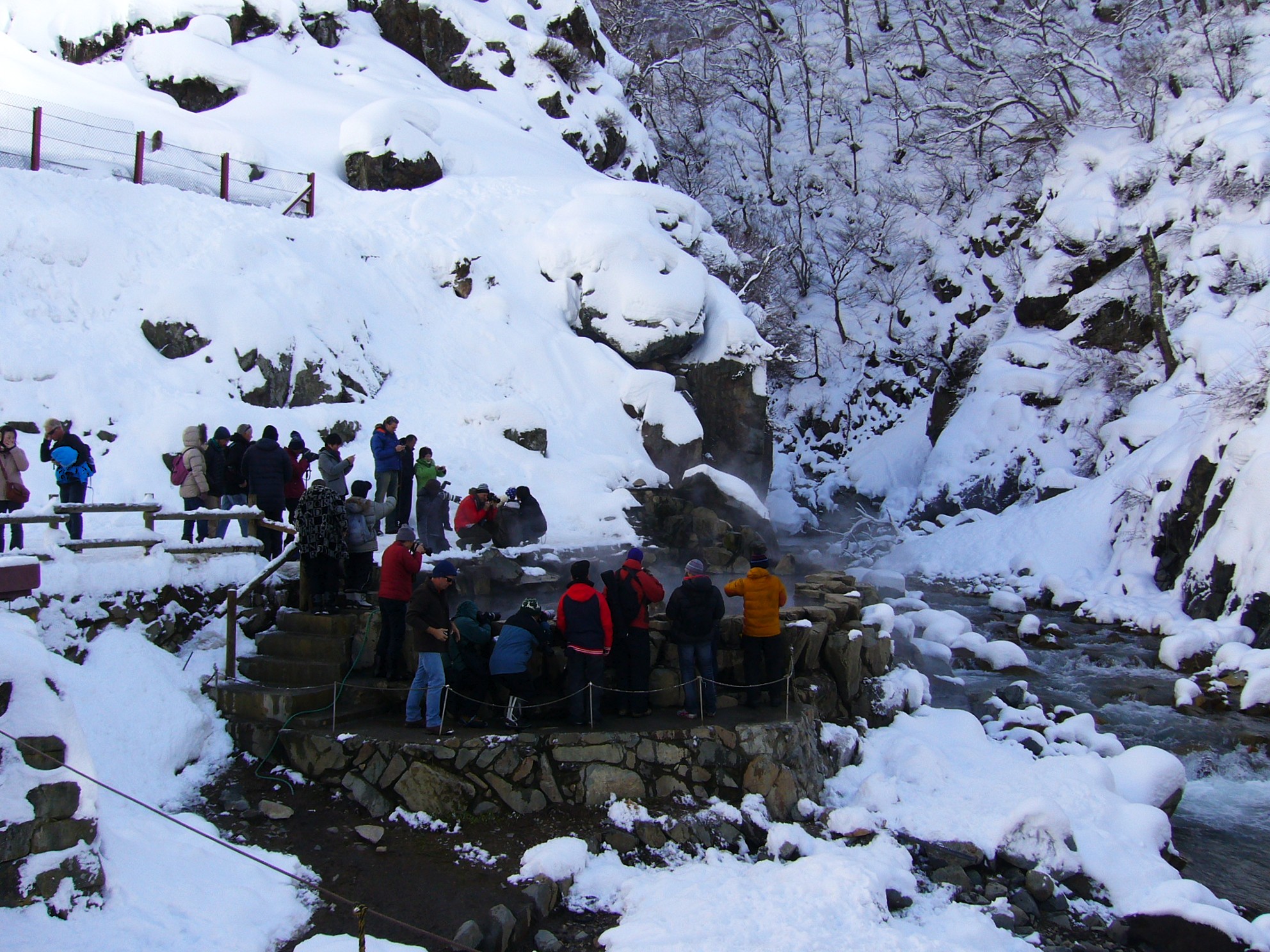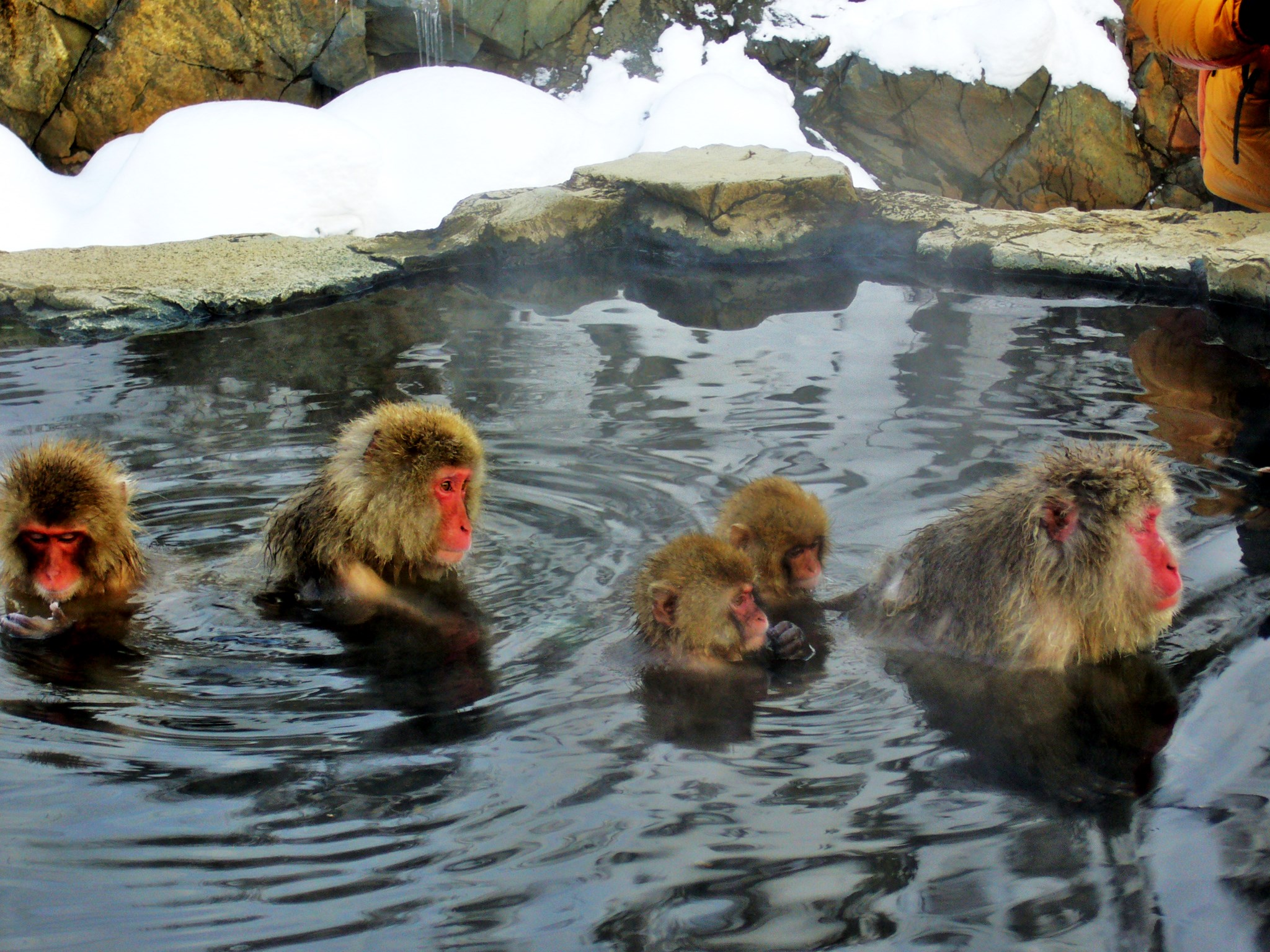 急峻な崖と、いたるところから立ち上る温泉の湯気、そのような光景を見た昔の人々はこの地を「地獄谷」と呼んだのだが、サルたちにとっては楽園の地なのであろう。寒さや飢えをしのぐため山を降りてやって来るサルの群れが、頭の上に雪を乗せじっと温泉に入る猿の姿は世界的にも珍しい。湯には真っ赤な顔をした猿が、気持ちよさそうに浸かっているその風景は、何度見ても一種不思議で、しかし心なごむ風景である。
