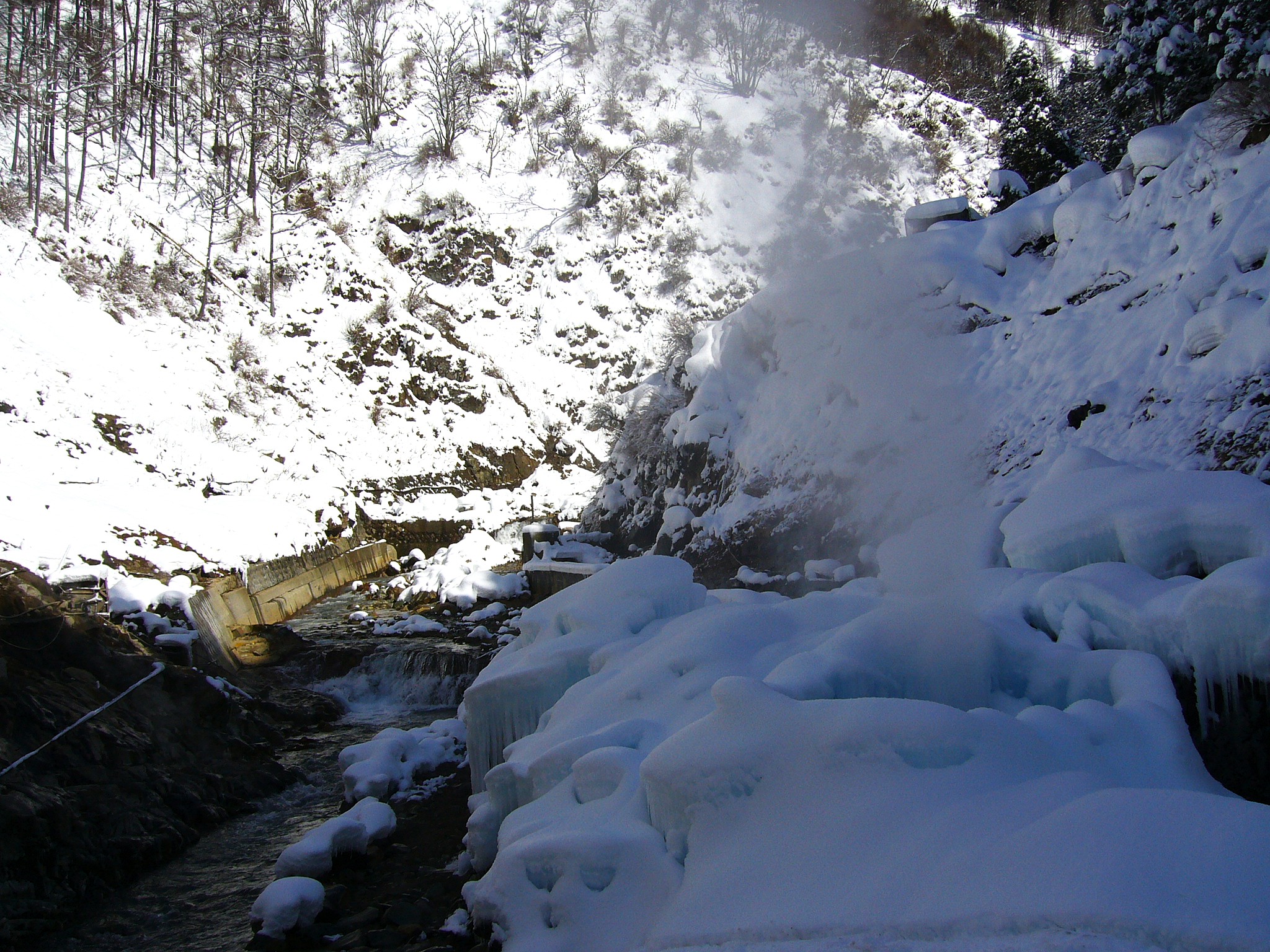 お目当ての露天風呂につかろうと外に出ると、毛繕いする2匹の猿に出くわした。人間に慣れているのか気にかける様子もない。運が良ければ、猿と混浴することもできるとか・・・。しかしまだ入浴時間が始まったばかりでお湯がまだ張れていなく、それも熱いということでそくそくと内風呂に戻ることになったのである。源泉は約50M離れた川沿いの岩間から湧き出ていて、温度は80℃近くにもなり、水を出しっぱなしにして湯温を調整している。泉質は弱アルカリ性でナトリウムやカルシウムを多く含み、神経痛、リウマチなどに効果があるとか。