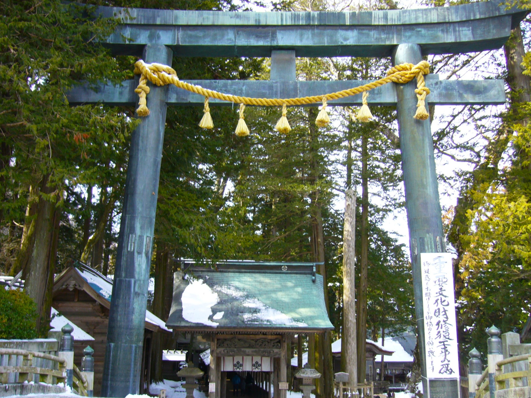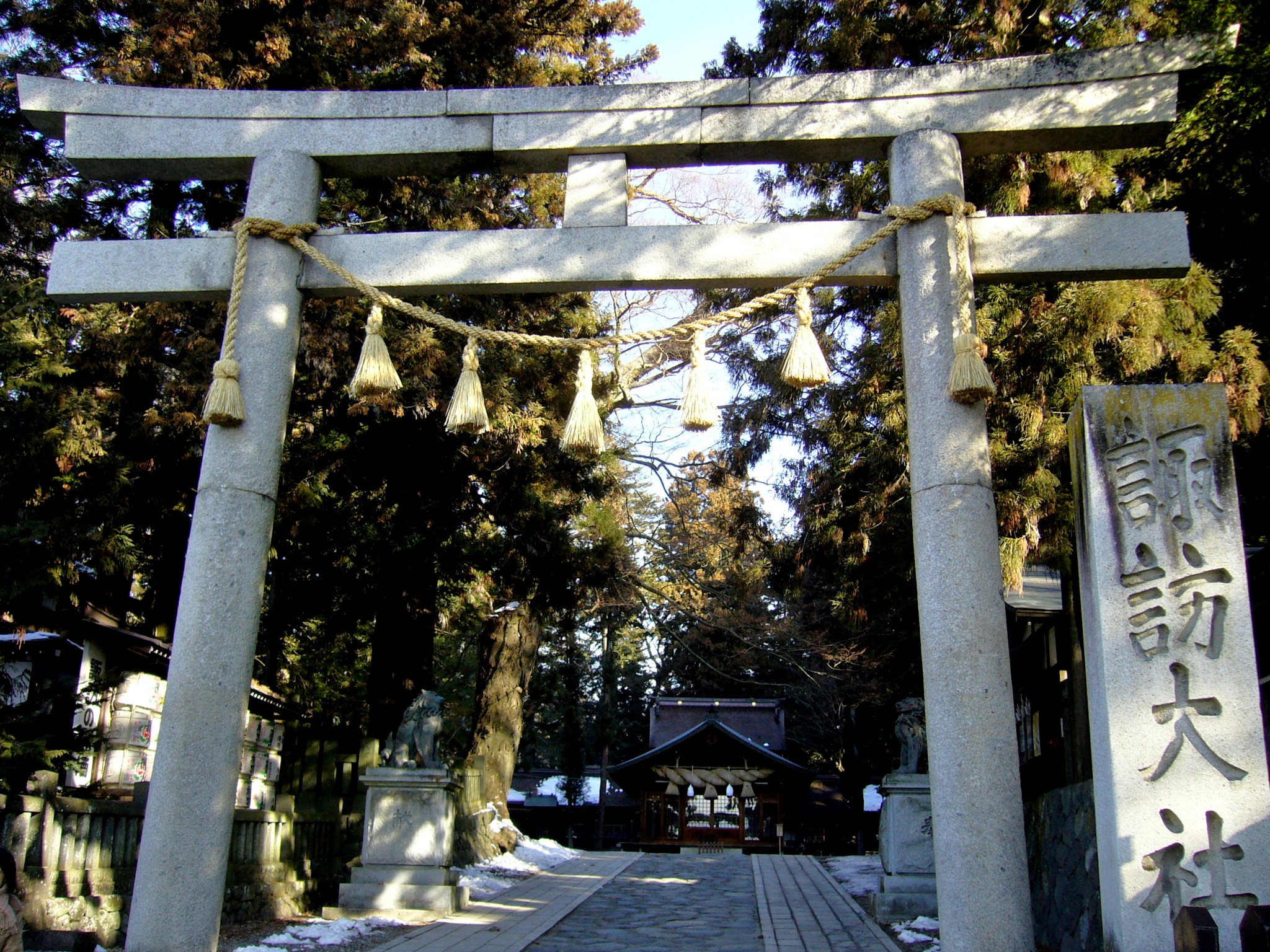 上社本宮は建御名方神を祭神とし、成立年代は1500年~2000年前とされ、古くは風の神、水の神、農耕・狩猟の神として信仰を集めていました。中世以降は東国第一の軍神として崇拝され、武田信玄をはじめ多くの名将たちが戦勝を祈願し、全国各地に分霊を持ち帰ったとされていて、そのため全国に一万余りの御分社が祀られています。鹿島神宮の武甕槌命(たけみかづちのみこと)が、出雲を支配していた大国主命に出雲王朝の支配権を天の神へ譲渡するようにと迫りました。これに対して、大国主の長男である建御名方命は国譲りに反対し、武甕槌命と力比べで負けてしまい、建御名方命は諏訪まで逃れたと伝えられています。