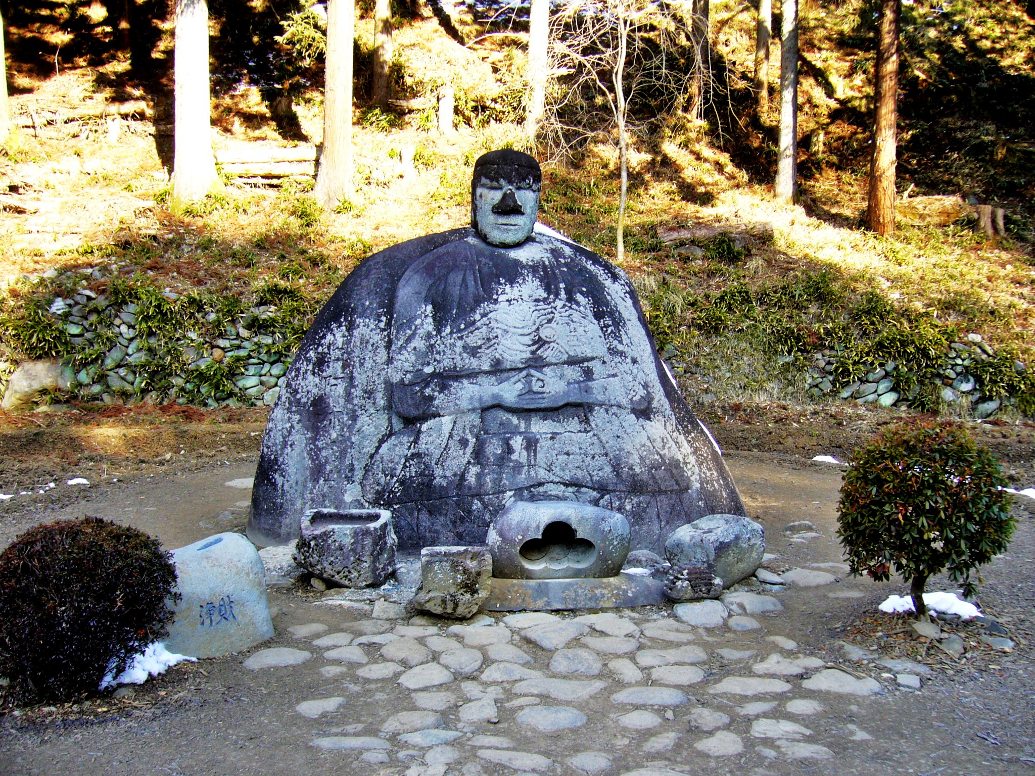 境内の西の清流が砥川で、川の中にある島は浮島と言い、どんな大水にも流れず下社七不思議の一つとのこと。お社は浮島社と言い、鎌倉武士が御射山の祭典に参列する時は、まずこの川で身を清め八島高原へ登山したと伝えられます。諏訪大社春宮から砥川にかかる赤い橋を渡った近くに鎮座する謎の石仏が万治三年と彫られていることから「万治の石仏」といわれているものである。春宮に鳥居を造ろうと石にノミを打ち入れたところ、そこから血が出たために造作を中止し、代わりに阿弥陀仏を刻んだのがこの石仏とされる。長い間一般にはあまり知られていなかったユーモラスな形の石仏で、世にでるきっかけをつくったのが今は亡き岡本太郎画伯なのだ。下諏訪の歴史的情緒を愛し、しばしば訪れた画伯が、昭和49年の諏訪大社御柱祭に来た時、これを見て、「世界中歩いているが、こんな面白いものを見たことがない」と絶賛、新聞や雑誌に書かれ、一躍有名になったのです。