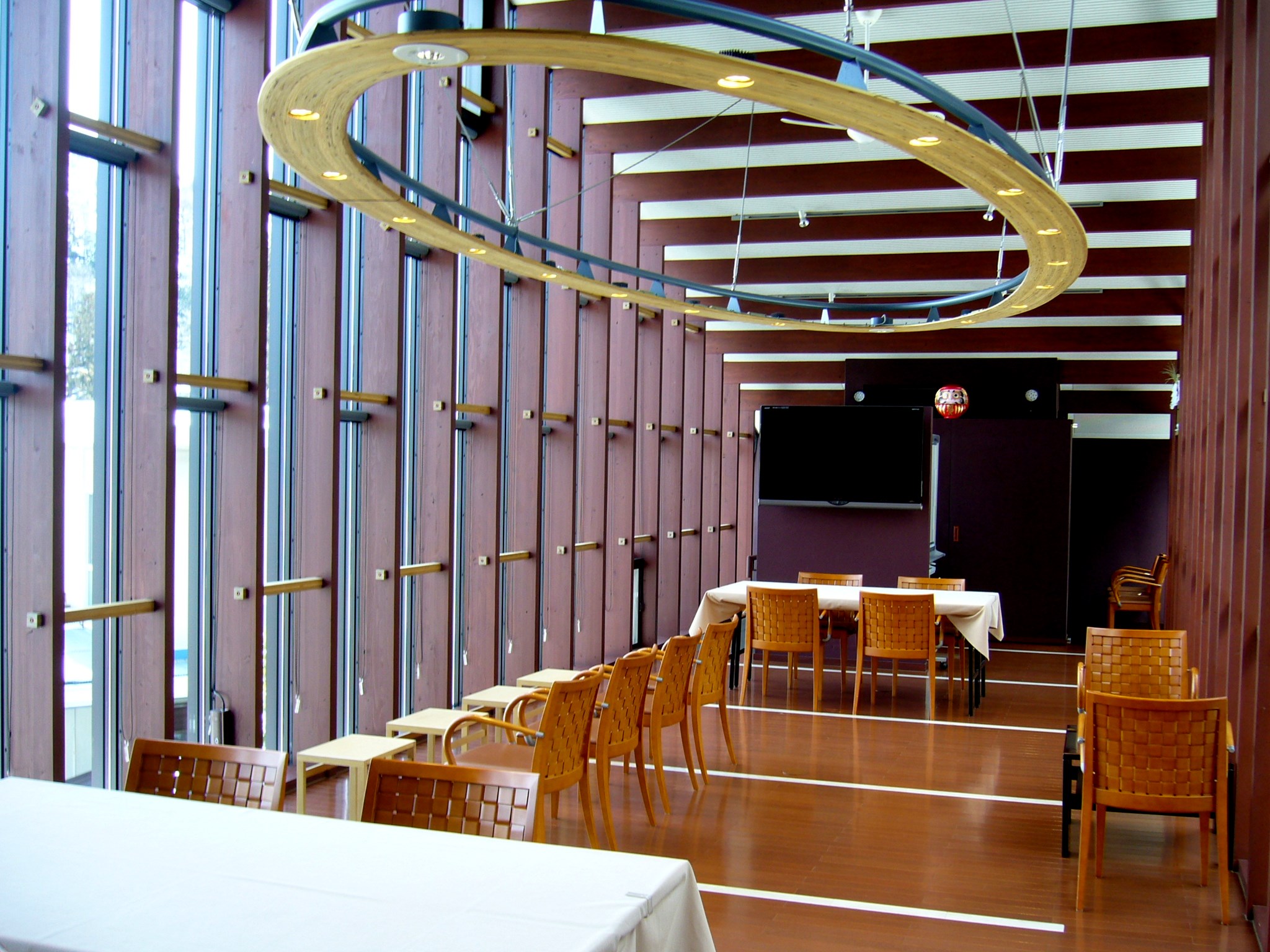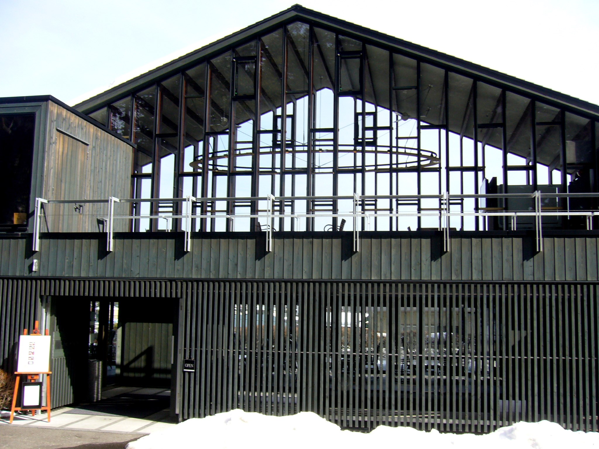 諏訪大社上社本宮一の鳥居前にあるのが、昭和18年創業の諏訪市内の日東光学(株)が、神社参拝客のためにショールームと会議室を兼ねた喫茶室を2011年にオープンさせた「金子茶房」です。ガラス張りの近代的な建物は、松本市出身の建築家柳澤孝彦+TAK建築研究所によるもので、室内からはもちろん、外からも建物をすかして八ヶ岳連峰が間近に見られるのが特徴です。