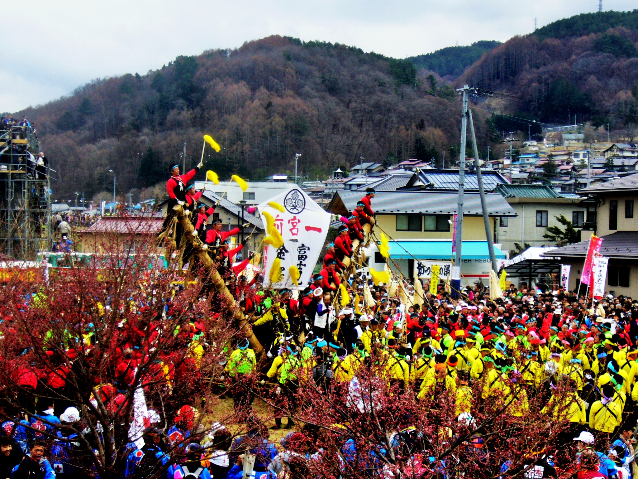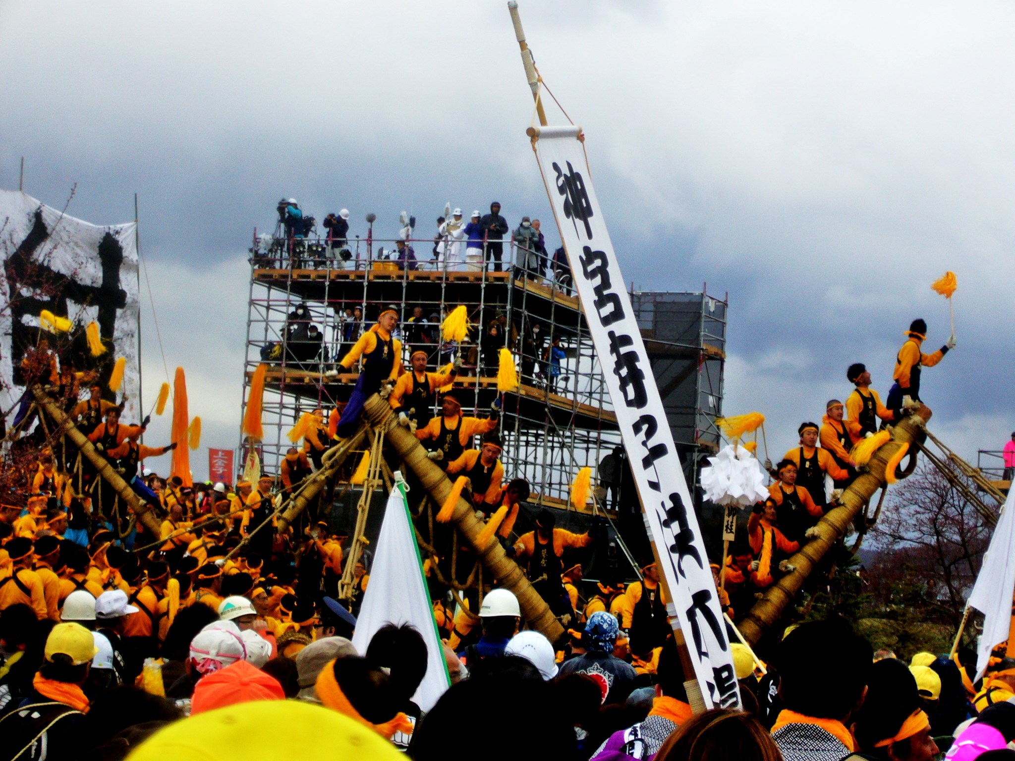 諏訪市・岡谷市・茅野市・下諏訪町等諏訪地方6市町村20万人の氏子が力を合わせて成し遂げる天下の大祭「御柱祭」、正式には「諏訪大社式年造営御柱大祭」といい、7年目ごとの寅と申の年に御社殿を造り替える祭事です。建築技術を伝える目的と新たに神が甦るという意味を持ちます。本殿のない諏訪大社では、御社殿の四隅に大木を曳き立ててそこに神が宿るとされています。諏訪大社は2社4宮で構成され、4本ずつ、計16本の柱が立てられることになります。柱となるのは直径約1m、長さ約17m、重さ約12tにもなる巨木で、この巨木を山から切り出し、人力のみで里へと曳き、各社殿を囲むように建てます。