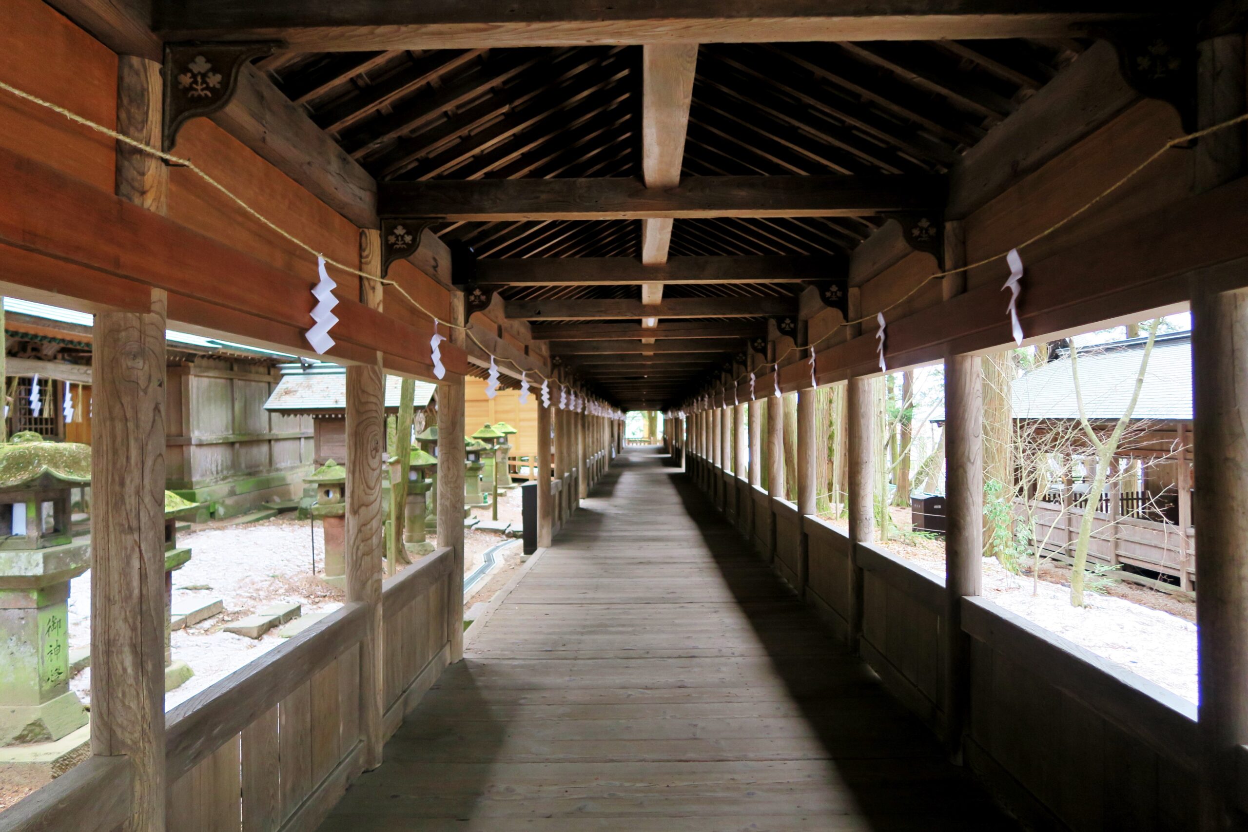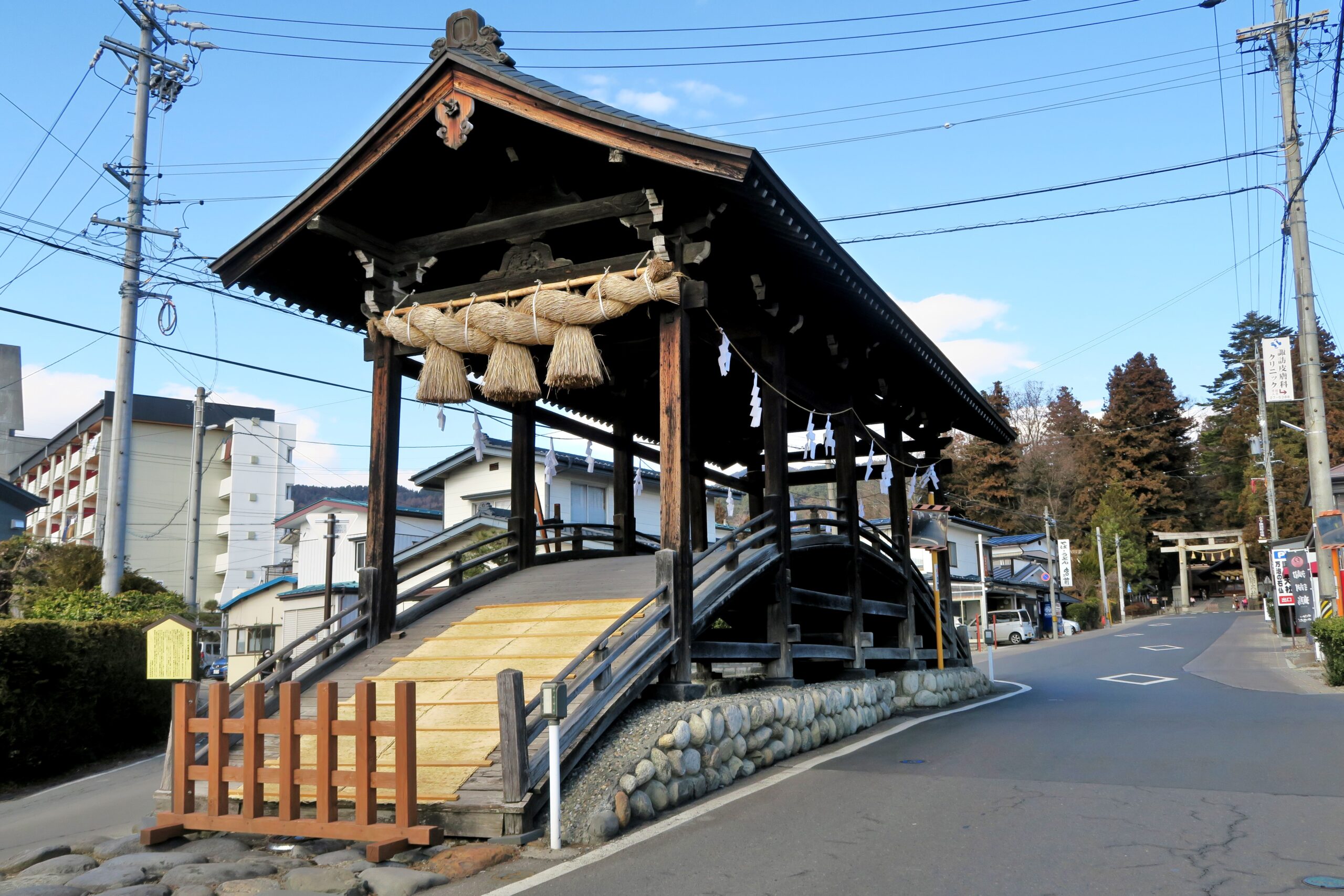 一の鳥居からが参道となっており布橋に続く入口門があります。前宮経由で繋がる御神体の守屋山のエネルギーを、廊下を通じて門から拝殿に引き込む構造になっているため廊下が必要になるとのこと。その布橋といわれる全長67mの回廊を抜けて拝殿に向かいます。明治になるまで、上社の最高祀職は「大祝」という生き神様でした。しかし大祝は少年で、信仰対象そのものでしたので、神事の一切は五官祝という5人の神官に任されていました。