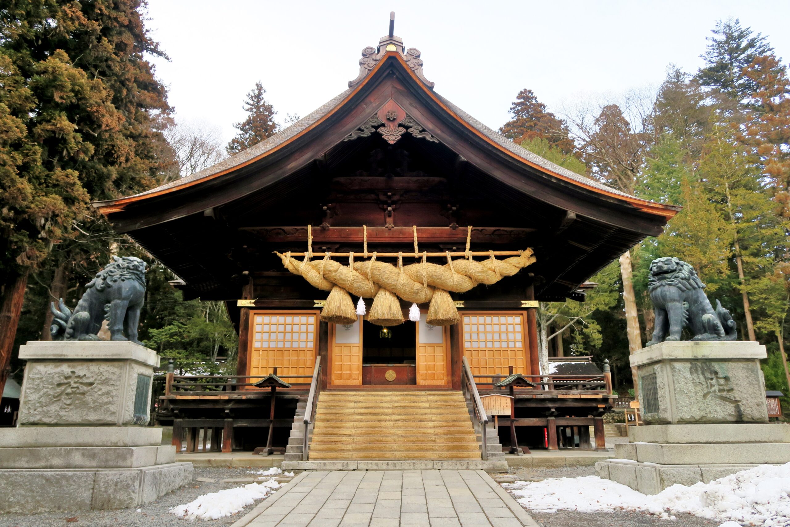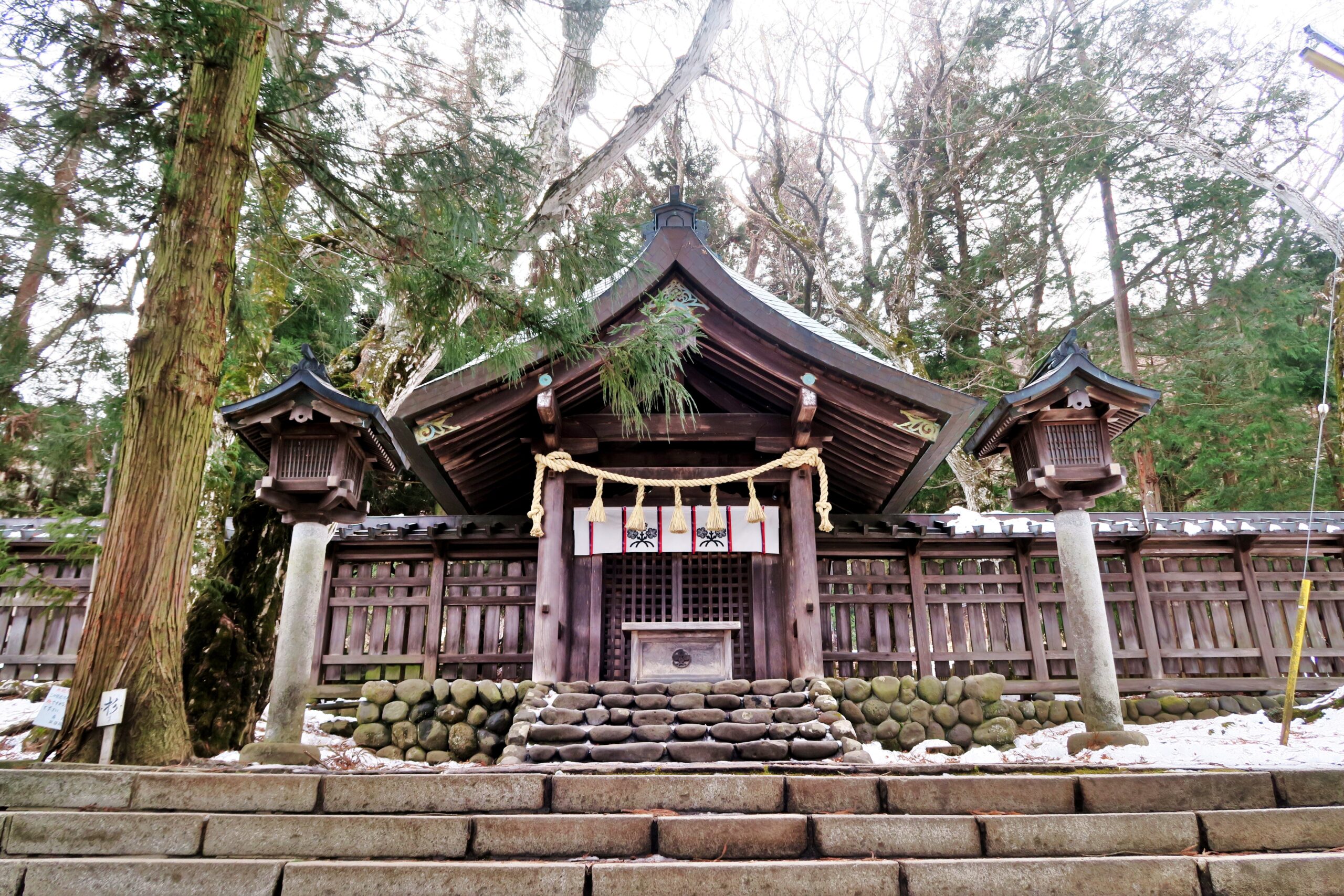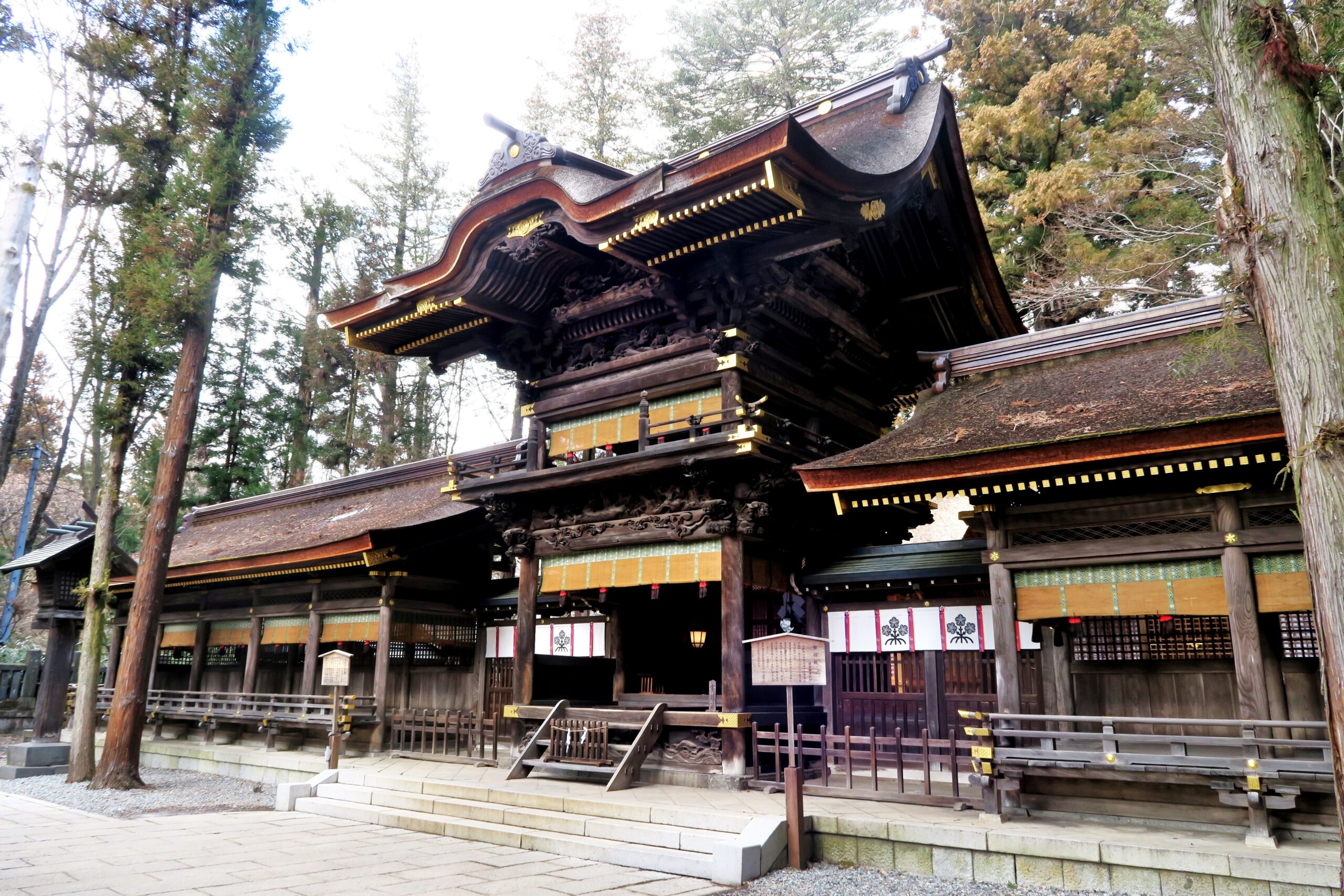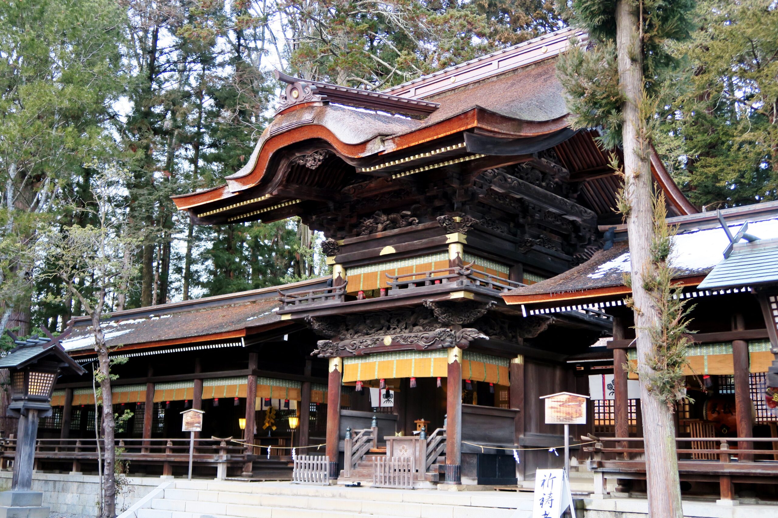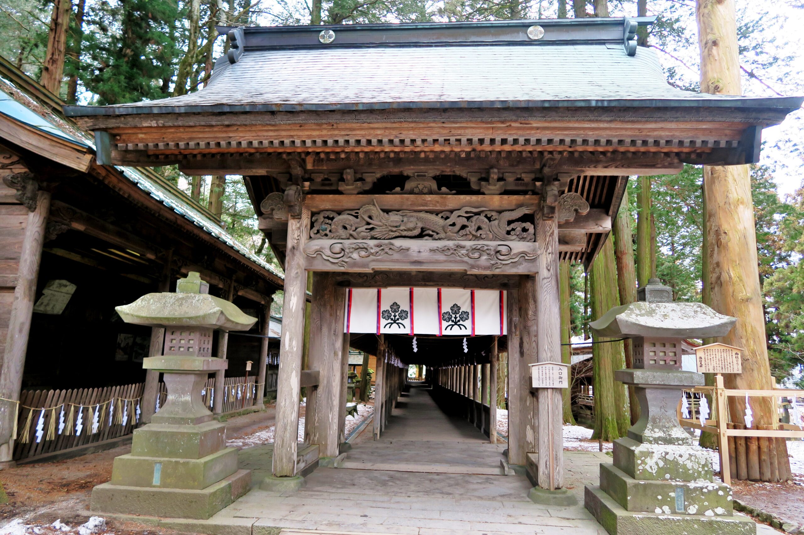 諏訪大社下社の最初の鎮座地とも伝えられている「下社春宮」。祭祀・拝礼を行うための建物は、中央の二重楼門づくりの弊拝殿、左右に建つ片拝殿ともに国の重要文化財に指定されています。拝殿の正面後方のご神木(杉の木)がご神体で、本殿を持たない原初的な神社形態です。