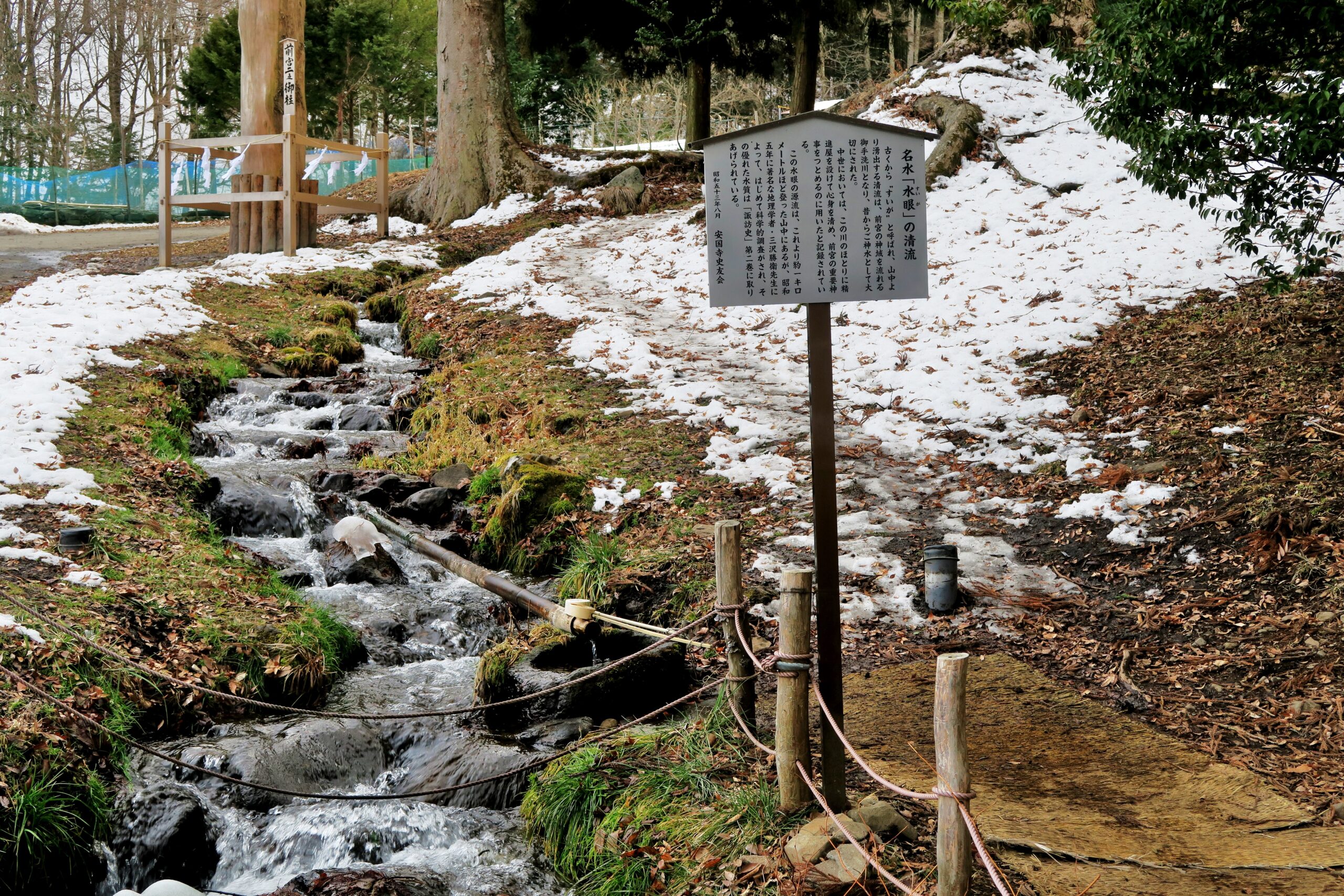 本殿脇、四之御柱付近には約1km先の御手洗川上流から湧き出た“水眼(すいが)の清流”が流れ、古くから御神水として大切にされてきました。