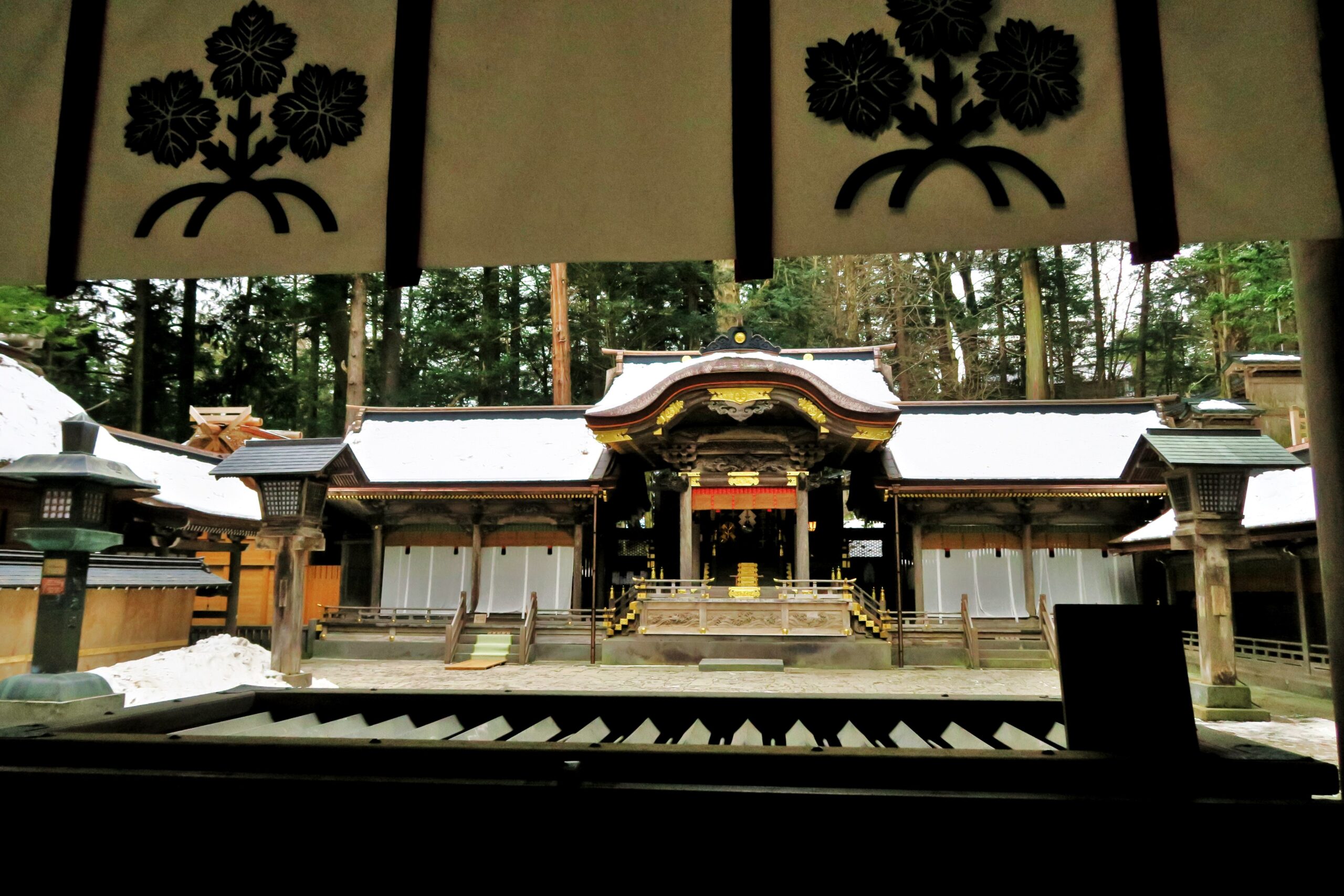 右奥にあるのは内御玉殿といい即位した大祝が神宝である「真澄の鏡」を胸に飾り、「弥栄の鈴」を打ち振って民の前におでましになったお社です。