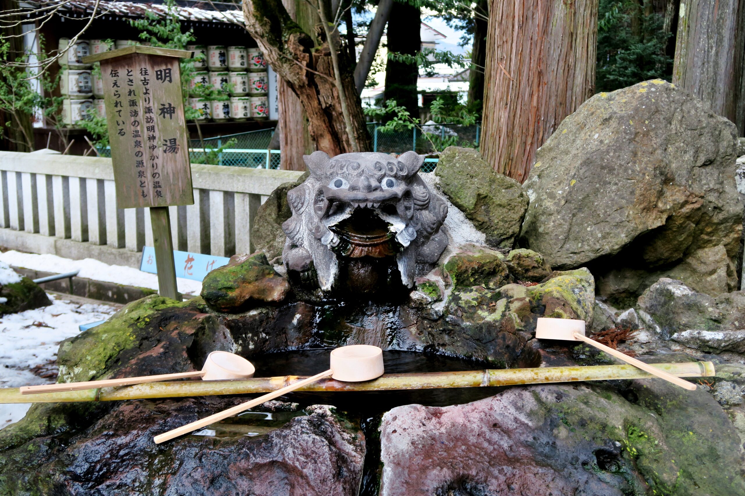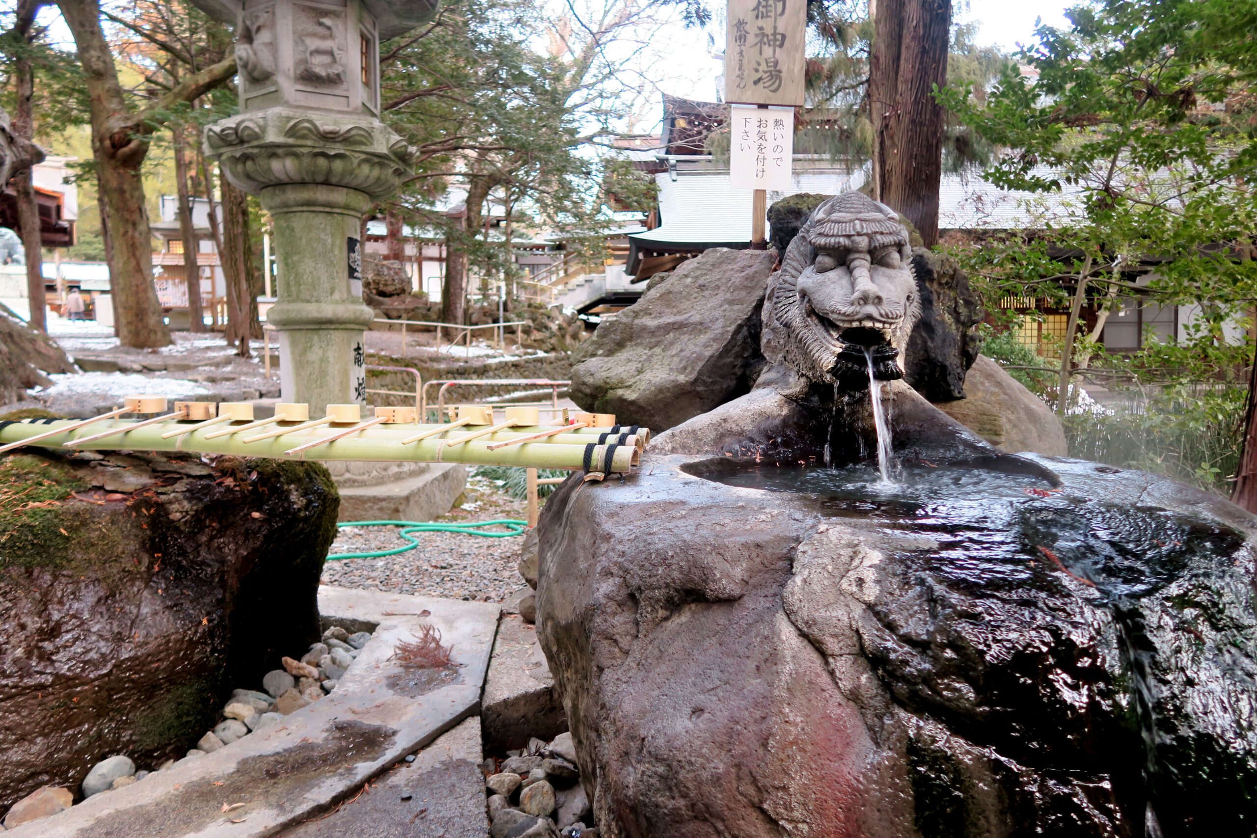 鳥居をくぐって、緩やかな階段を登りきった右手に、下社秋宮は八坂刀売神の開湯伝説にまつわる温泉の湧出地でもあり、境内に温泉が湧き出ている全国でも珍しい御神湯の手水舎があります。湯口は竜神伝説にちなんで竜の口、かなり熱い天然温泉が流れ出ています。