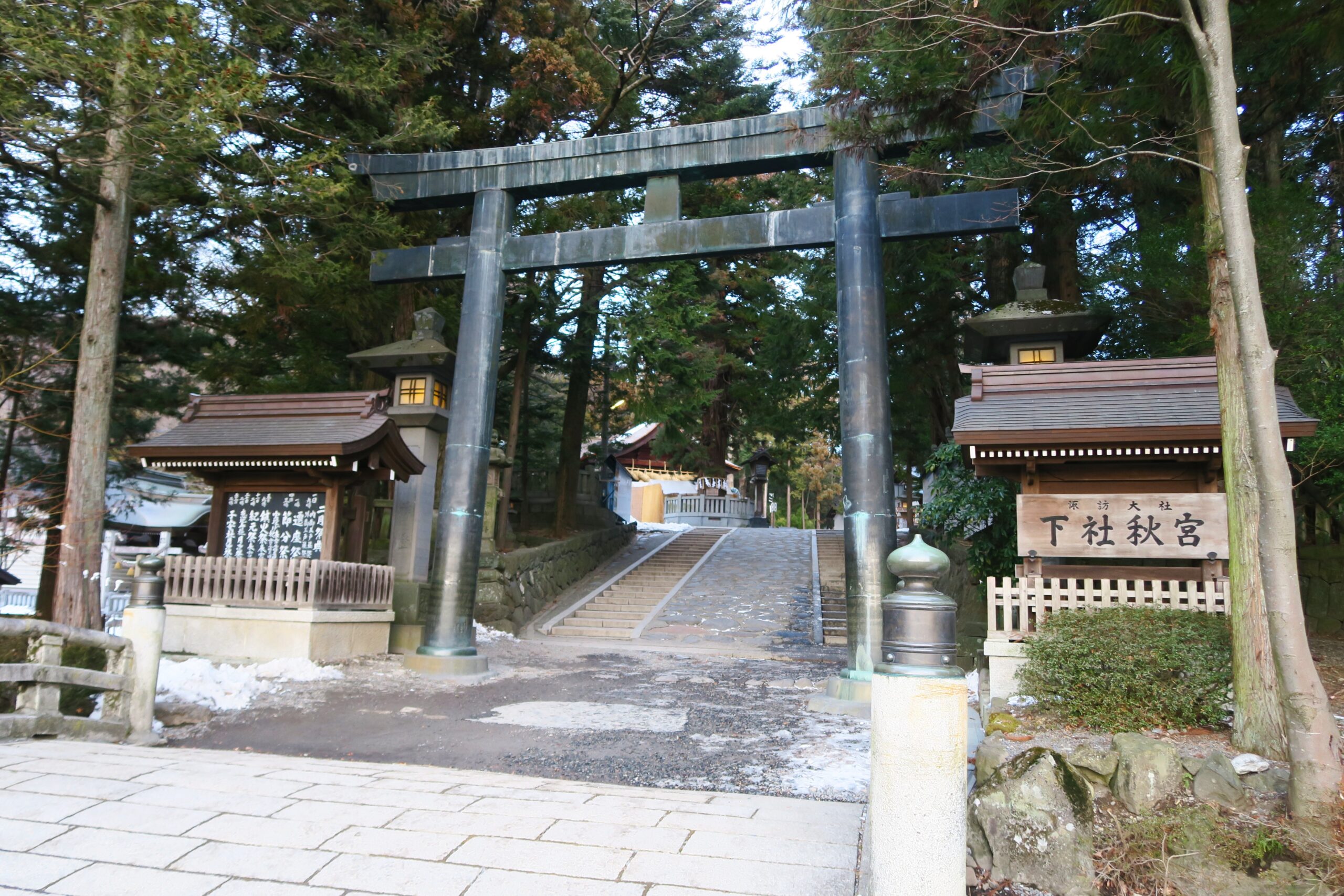 下社は、春宮・秋宮ともに、建御名方神の妃である八坂刀売神 (やさかとめのかみ)をお祀りし、家庭運・結婚運をもたらすパワースポットです。古代、現代よりはるかに広かった諏訪湖をはさんで南に男神・上社、北に女神・下社が向き合っていたのが原型で、古い時代から今でいう「通い婚」スタイルでした。その通った足後が諏訪湖の氷の亀裂として現れると伝えられ、「御神渡り」とされ、上社と下社をつなぐように起こりやすく、両神の出会いと信じられていました。諏訪湖が全面結氷した時に起きる自然現象で、氷が割れ山脈のように連なり、長さは数キロにもなり、この氷の亀裂の盛り上がり方などから、その年の天候や、農作物のことを占います。