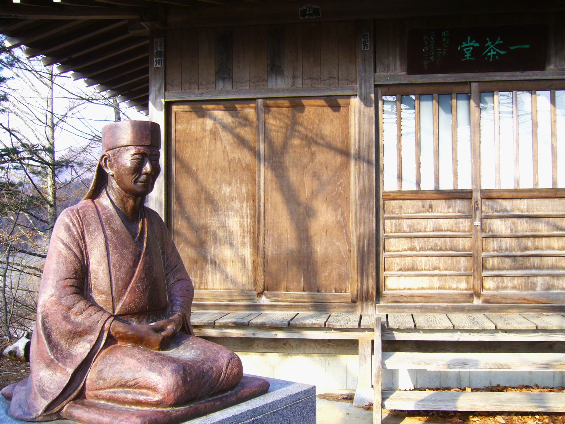 そんな湯田中温泉の裏山に、約2KMにおよぶ一茶を偲んでつくられた遊歩道「一茶の散歩道」があります。「三弦の ばちで掃きやる 霰哉」「子どもらが 雪喰いながら 湯治哉」をはじめ、一茶の句がしたためられた25の立て看板が立ち並んでいます。 一茶堂には小林一茶の像が、また散歩道入り口には、本堂に一茶の木造を安置する梅翁寺もあり、一茶に思いを馳せながらのんびり歩けます。
