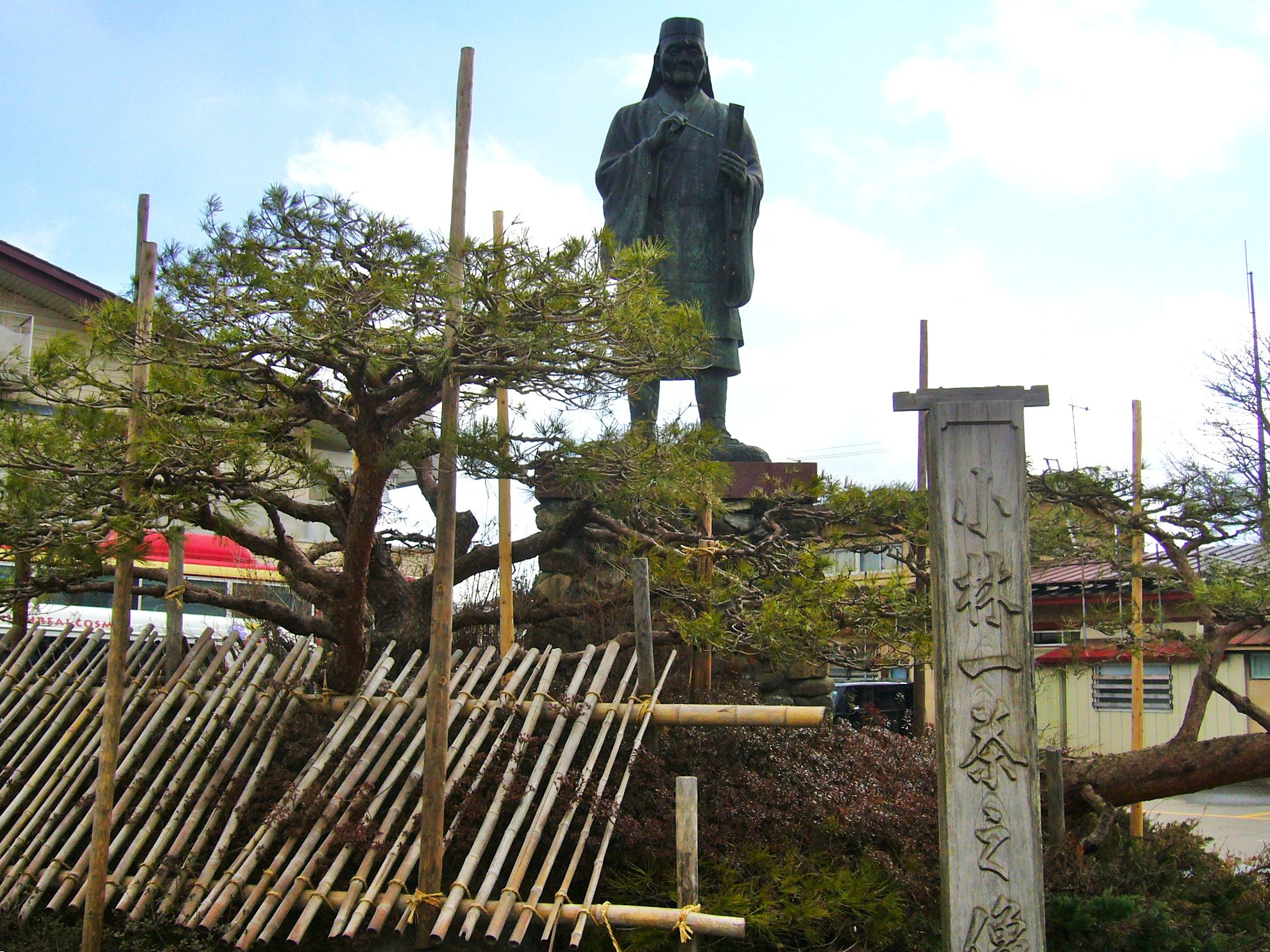 「史跡小林一茶宅」には、29歳の14年ぶりに帰郷した際に詠んだ「門の木も 先つつがなし 夕涼」の句碑がある。