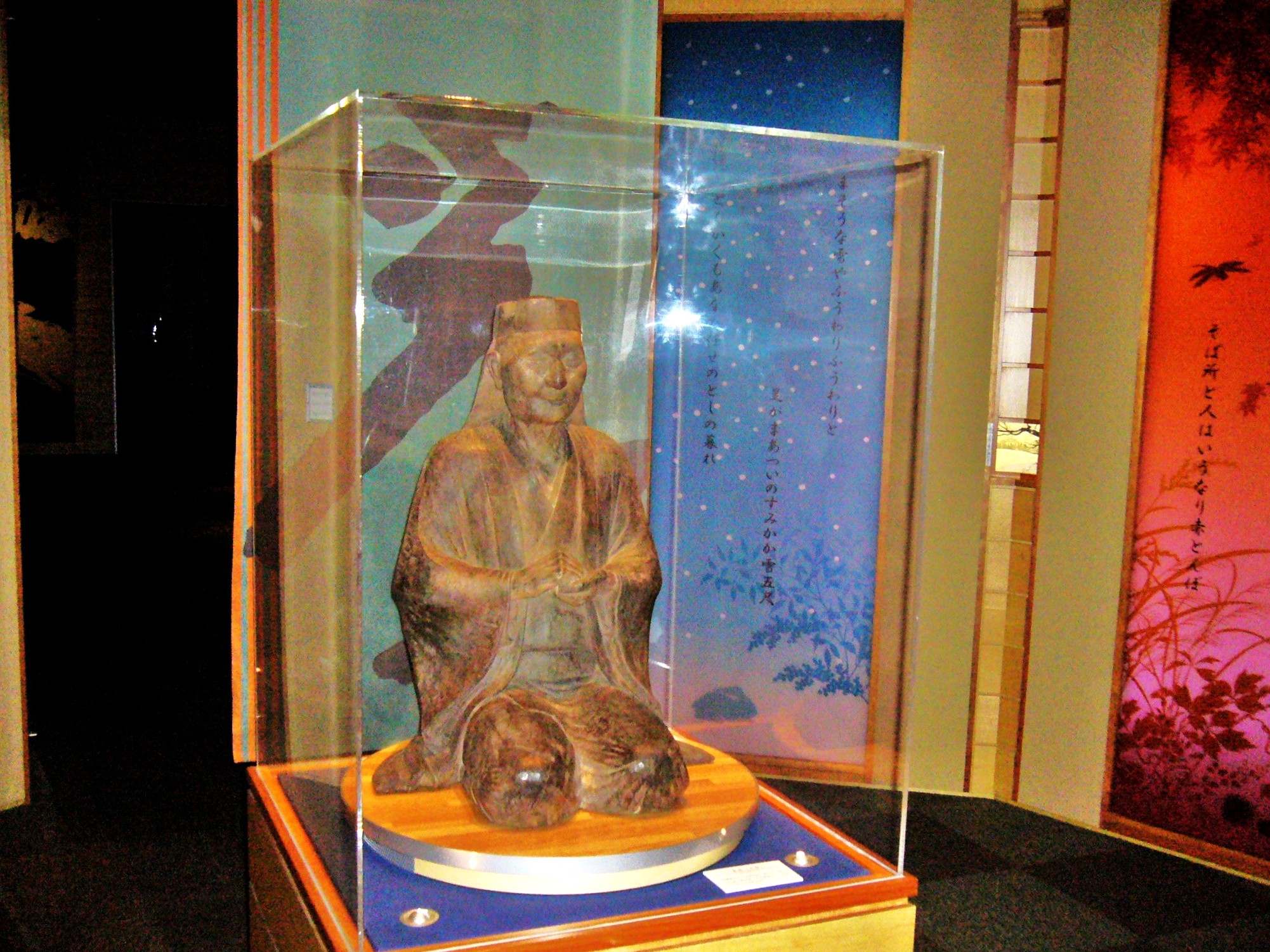 長野市立博物館をはじめ松本市美術館、北斎館などを手がけた建築家・宮本忠長氏設計のモダンな建物の記念館は、ガラス、鉄、金属など硬質な素材を使いながら、抑えた色あいと、天井から軒先に続く地域材のカラマツの木質感が一体となった、やさしい印象を受ける。そして天井のカラマツがそのまま外の軒先まで続くことで、伸びやかさと広がりをも感じさせてくれます。建物内からも一茶が眺めたであろう北信五岳の黒姫山や飯綱山、妙高山を望めるように配慮された「展望ラウンジ」と名付けられたスペースがあります。記念館では、一茶の生涯を辿りながら、「七番日記」「おらが春」などの、貴重な一茶作品を見ることができます。一茶の故郷柏原宿のようすや、一茶顕彰に関する資料なども展示されています。(入館料500円)
