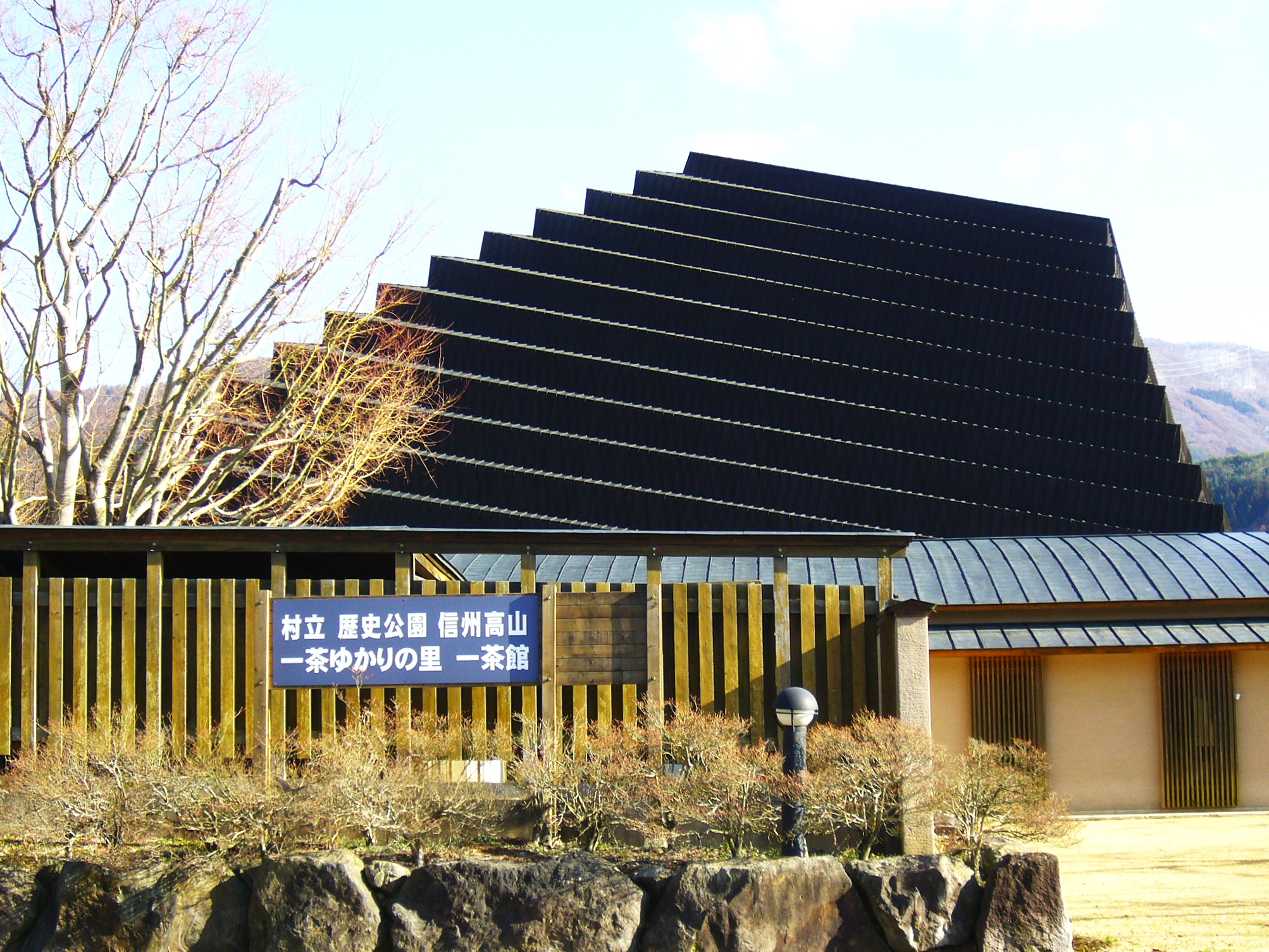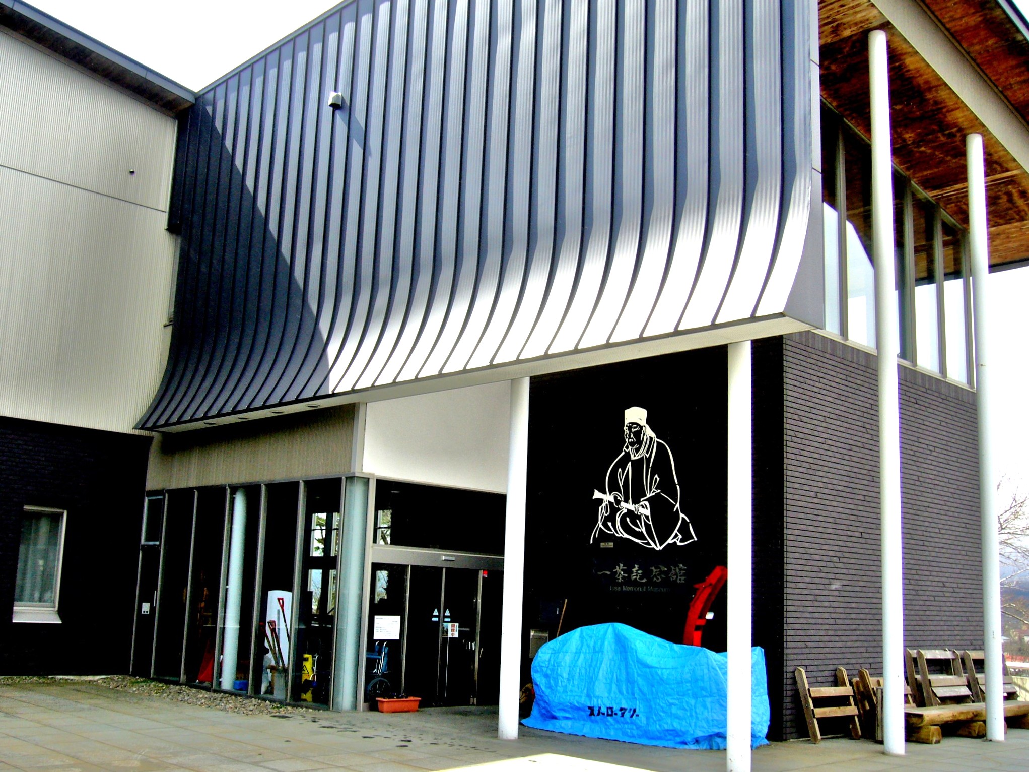 俳人・小林一茶生誕の地であり、一茶65歳、波乱万丈の生涯を閉じた信濃町柏原に、2003年、新たな一茶研究の殿堂「一茶記念館」がオープンしました。一茶終焉の地である旧宅が国の史跡に指定されたのを記念して、昭和35年(1960)一茶の墓のある小丸山にが旧一茶記念館が開館してから老朽化と収納スペース不足に伴う建て替えですが、小丸山公園の見晴し抜群のロケーションを存分に生かした、透明感とぬくもり感あふれる現代建築です。