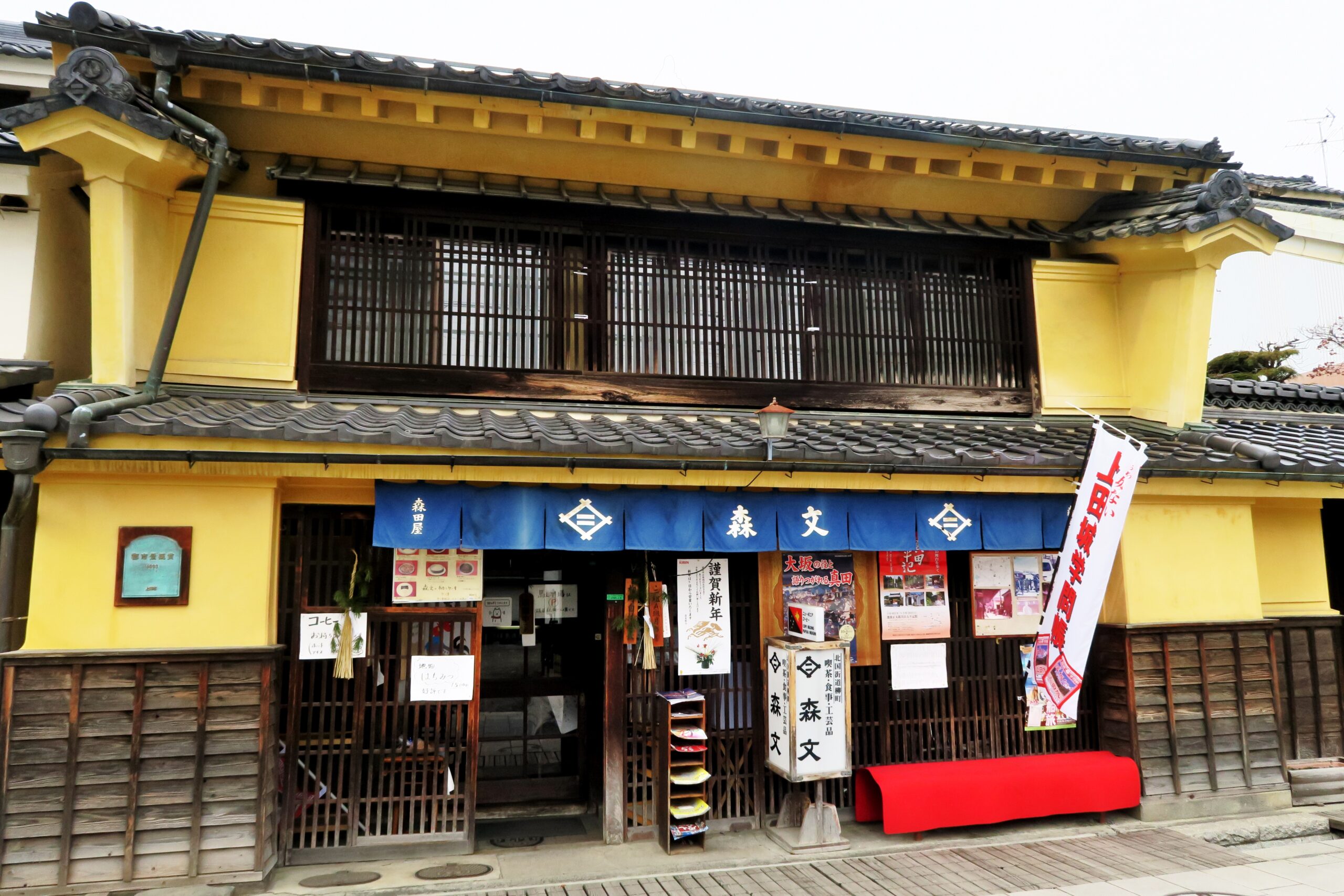 おお西の向かいに明治9年に建てられた元呉服屋-その後簡易郵便局になった建物を使った喫茶店「森文」があります。「卯建」の上がる建物は幕末期の建主の心意気です。こじんまりとした店内には、古いオーディオからジャズが流れています。先代から受け継いだ家伝の「強飯膳」が人気で、昆布や鰹節のダシと旬の素材がよくなじんで、おふくろの味を思い起こさせるおいしさです。手作りのケーキは6種類ほど揃い、酸味と苦味のバランスが絶妙なニューギニアブルーマウンテンのコーヒーがよく合います。