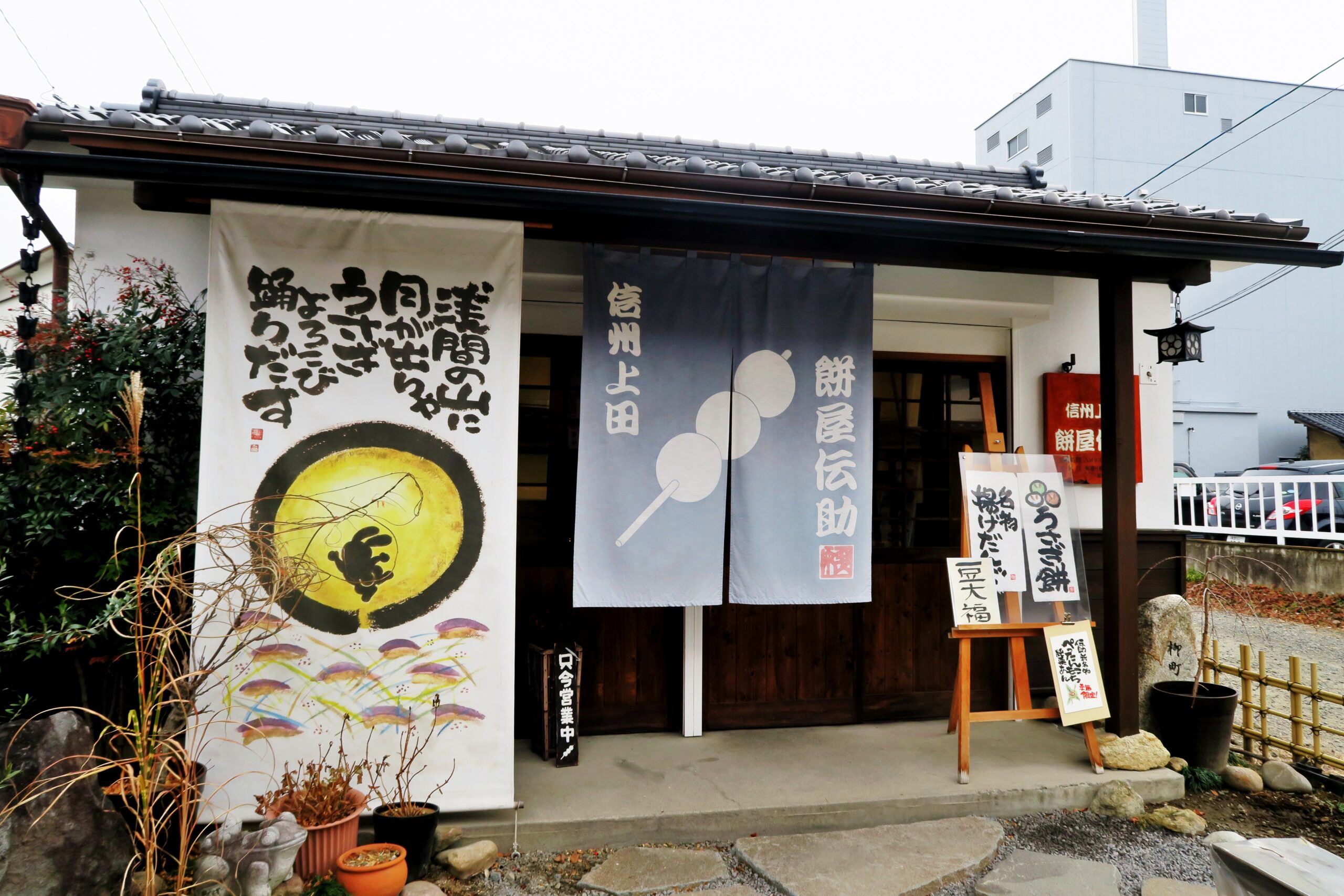 上田市街の上田原に本店がある「餅屋伝助」の柳町店。蔵造りのお店は昔の休み茶屋のイメージです。ふっくらとした弾力が持ち味の餅の生地には、地元塩田産のコシヒカリが使われています。せいろで炊いたコシヒカリ米をつぶして作る伝助独自製法のお餅です。ご飯を杵でついて作られた餅には自然と甘さと風味が残り、もち米の餅よりあっさり歯切れがよく、時間が経っても固くならないので翌日も柔らかです。クセになる食感です。※閉店・上田原の本店で営業中