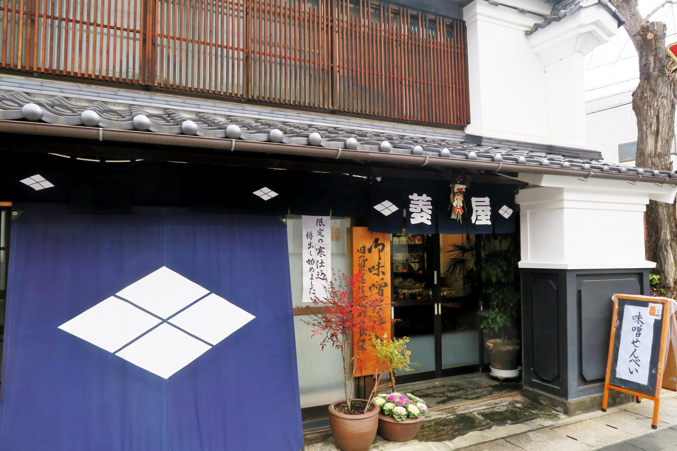 通りの一番北にあるのが「菱屋」。昭和5年(1930)創業の武田味噌の直営ショップです。一時は卸のみの扱いでしたが、北国街道にある柳町の道路改装を機に小売部門の復活となりました。定番商品から業務用、贈答用におかず用の味が付いた味噌や白みそ、赤みそ、半熟仕込み味噌など、用途に合わせてお好みの味噌が選べます。おすすめは、100gからの量り売りで好きな量だけ買える武田みその一番の人気商品「寒仕込」です。一年中で一番寒い大寒に仕込んだ味噌で限定生産のためこの店だけの限定販売となっています。味噌を美しく盛り込んだ樽から漂うやさしく甘い匂いに心も身体も和みます。