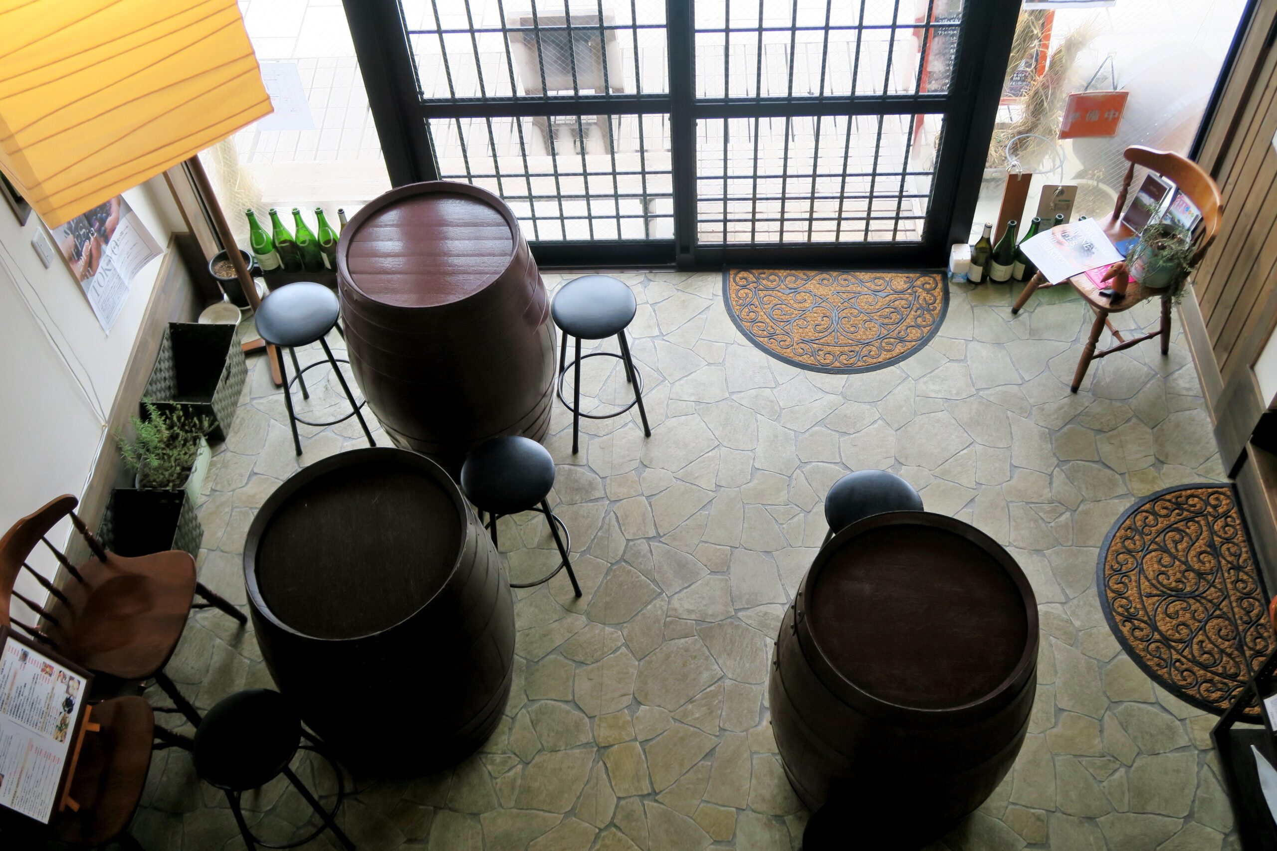 上田市のお隣東御市にある日本一小さなワイナリー「はすみふぁーむ」の直営アンテナショップ「はすみふぁーむ&ワイナリーShop&Cafe」があります。一階では、はすみふぁーむのワイン各種、ジュース、ジャムなどを購入できるのはもちろん、ワイン樽を利用した3卓のテイスティングテーブルが設置されていて、スタンディング・スタイルでの有料のテイスティング・カフェとしても利用できます。シードルやナイアガラドライ、メルローなどが一杯300円で味わえます。
