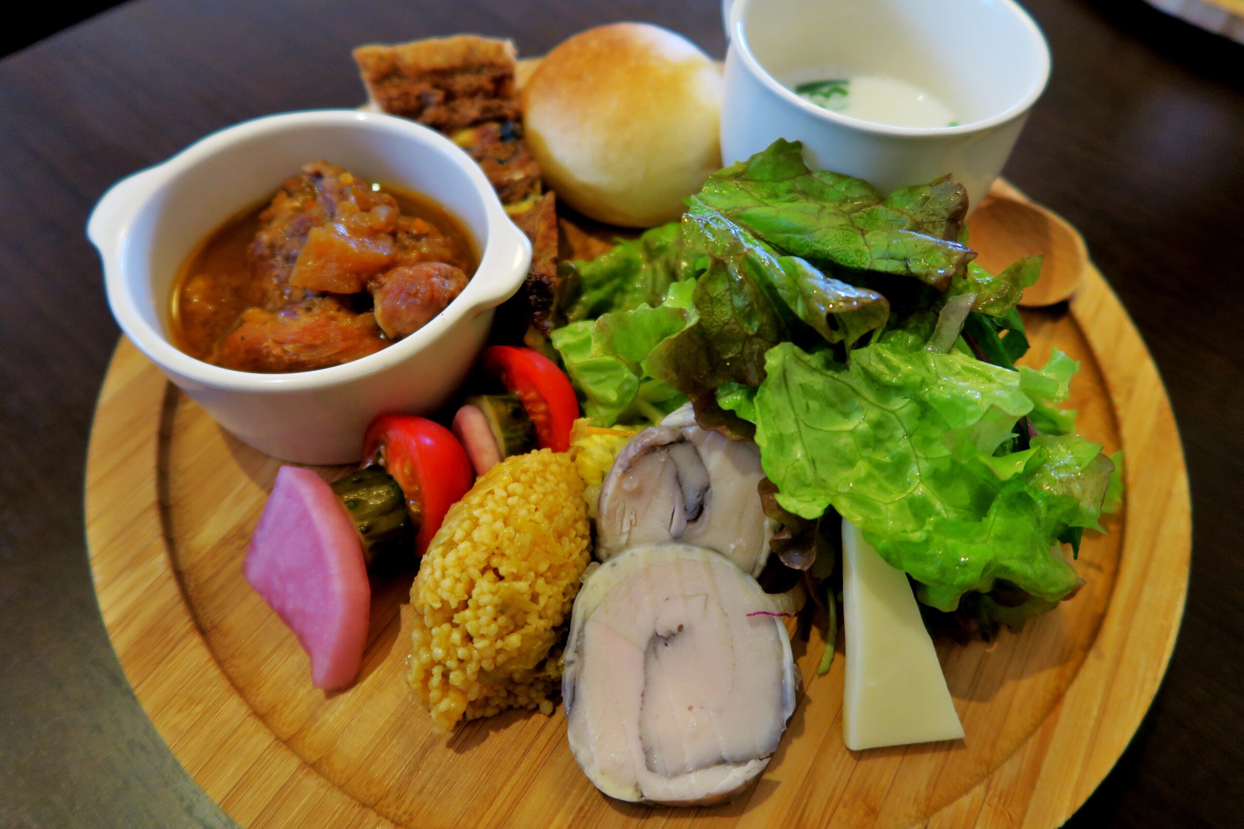 ここでのおすすめは2階のカフェルームでのイタリアンとフレンチに精通したシェフによるワンプレートランチ1000円です。一皿の中にこの日は、大根とお米のポタージュスープから右回りに地元産の新鮮野菜サラダ、はすみふぁーむがあるお隣東御市にある「アトリエ・ド・フロマージュ」のチーズ、赤ワインの澱に漬けられた信州福味鶏胸肉のハム赤ワイン風味、キャベツとクスクスのマリネ、ピクルス、信州太郎ぽーくスネ肉とりんごのシードル煮、5種のきのこが入ったキッシュ、そして自家製信州ミルクパンです。是非シードルとのマリアージュを楽しんでみてください。ミルクパンは一個だけおかわりができますよ。