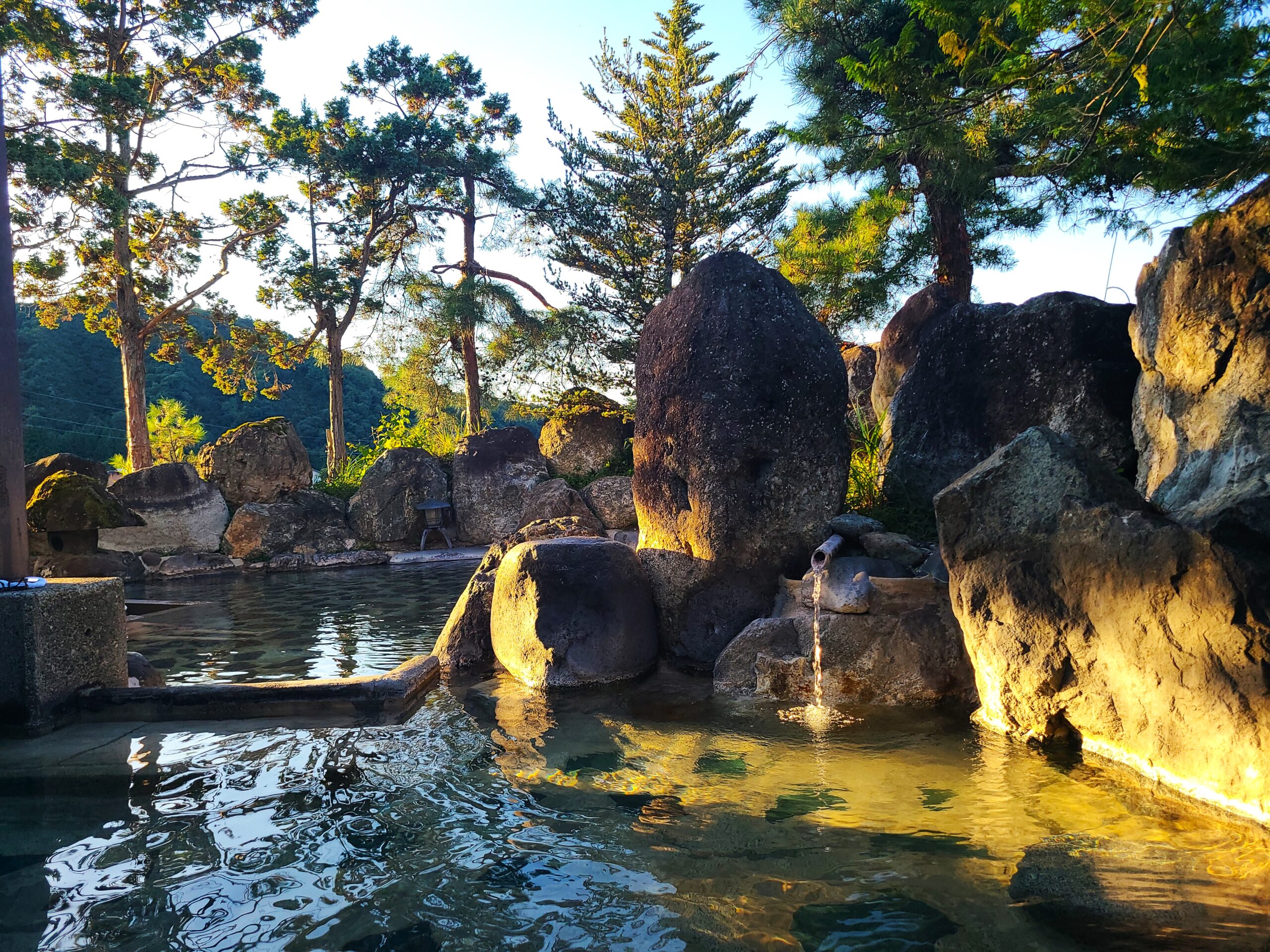 下山後は、お決まりの入浴Timeです。八海山ロープウェーから約11km、車で20分ほどのところにあるのが「五十沢温泉 ゆもとかん」です。新潟県内ではめずらしい混浴の源泉100%、かけ流しの広大な岩風呂と大露天風呂があります。16時からは男性専用となり気兼ねなく湯をたのしめました。