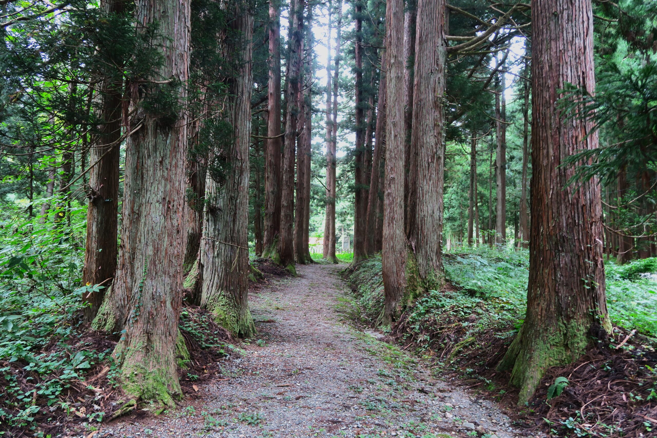 一の鳥居から二の鳥居までの参道(約440m)は古くから八海山信仰の信者や氏子達により整備され、寛政6年(1794)には木食普寛行者(御嶽山大滝口開削)が屏風道を開削した際、記念として植樹され、さらに天保7年(1836)の大干ばつの際、周辺24集落の懇願で当時の藩主がその対策の一環として植林したもので樹齢250年を越える杉並木(256本)が続きます。