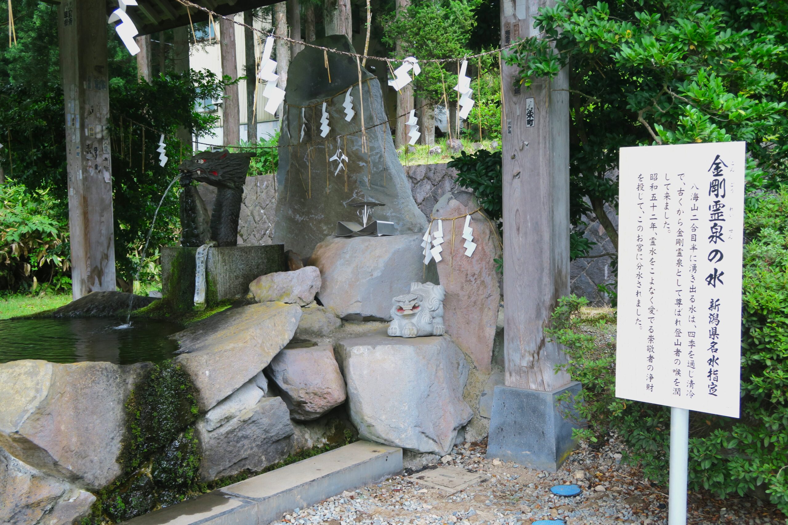 手水舎は古来、御神水として尊ばれてきた金剛霊泉(八海山二合目半)の清水を分水したもので、昭和60年(1985)には新潟県名水に指定されています。