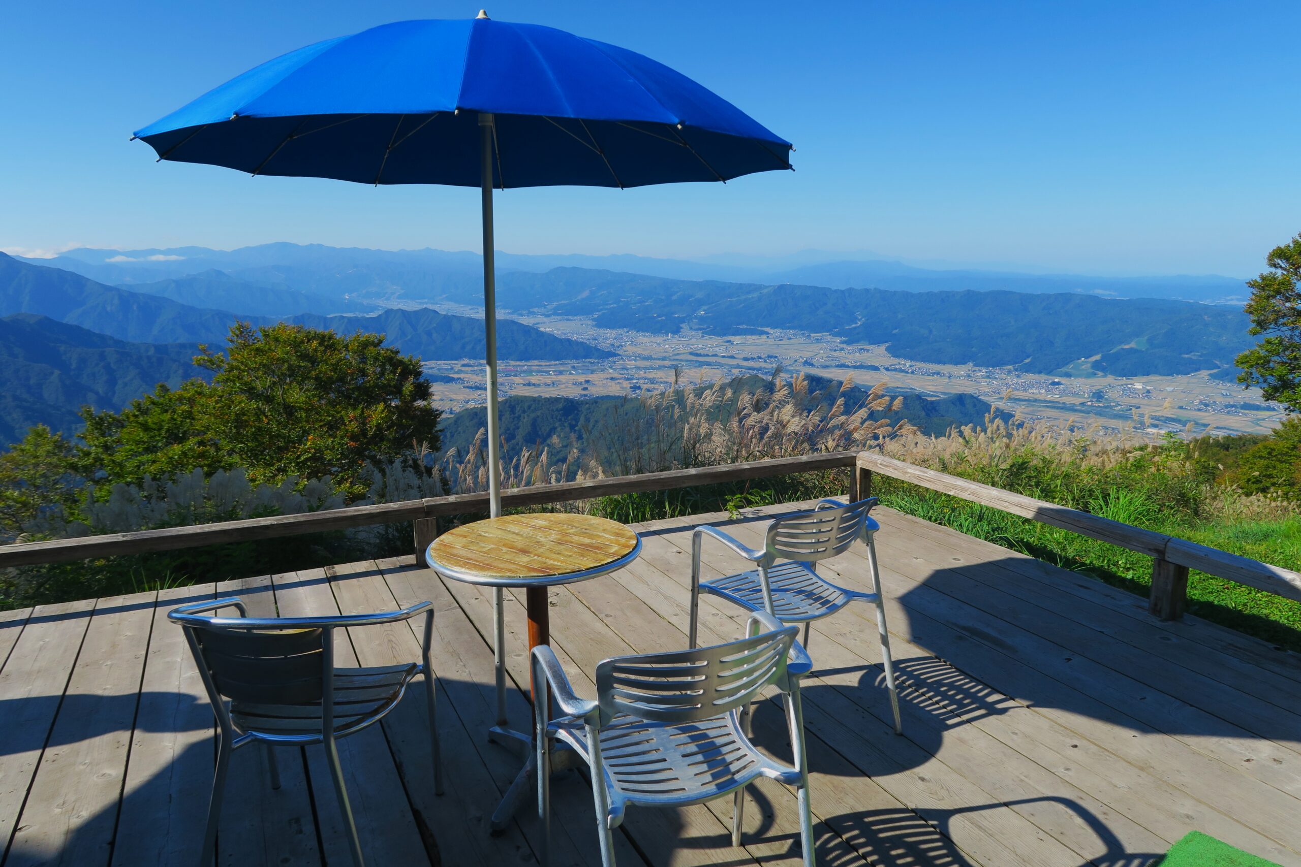 9時発のロープウェーに乗り山頂駅を出たところにはテラス席もあり、しばし谷川連峰など上信越県境の山々が見渡せ、手前に魚沼の田園景色が堪能できます。