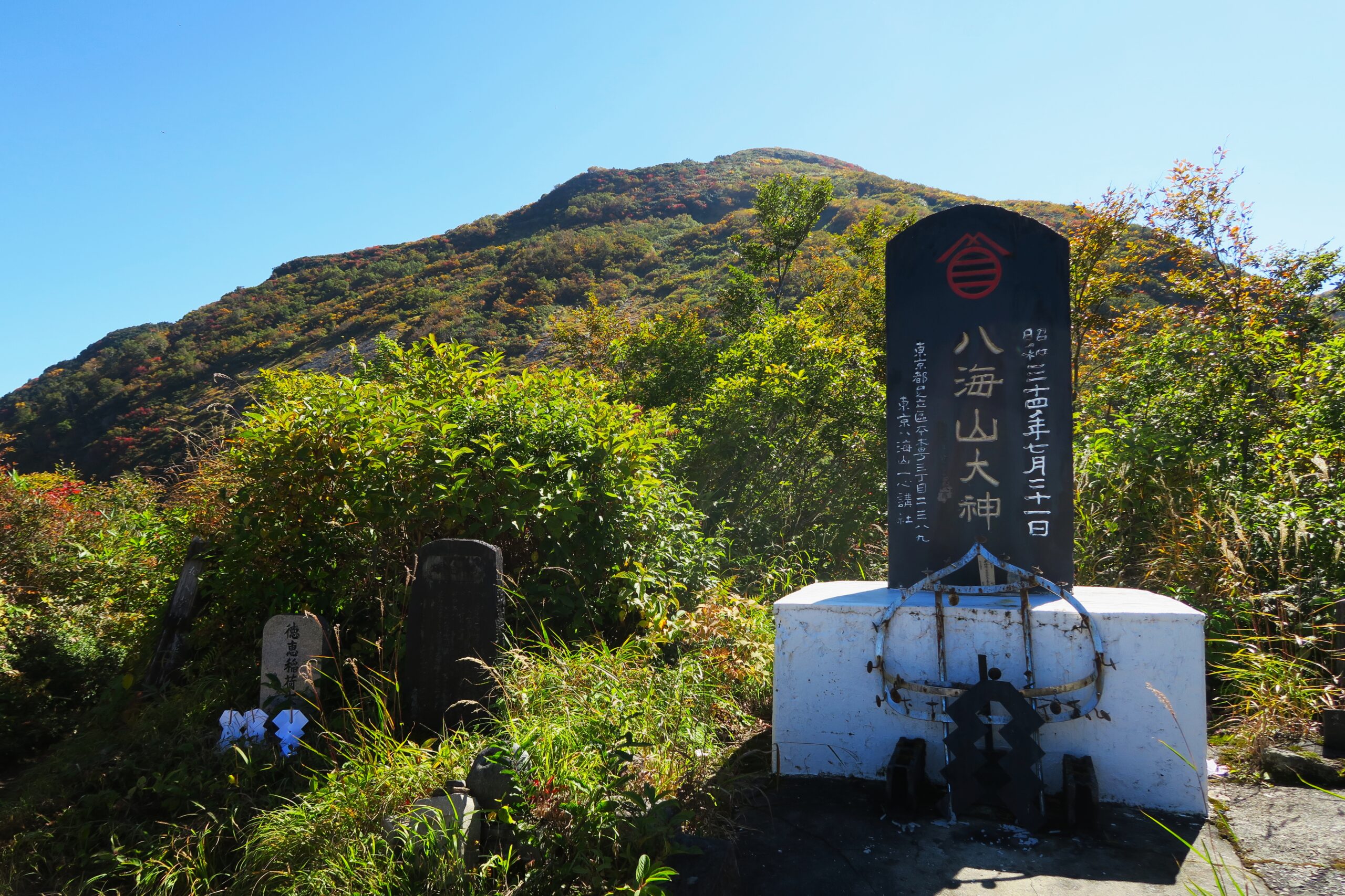 右手に身ながらブナ林を登っていきます。広葉樹の林の中は涼しく、合間に見える魚沼の田園風景が少しづつ遠くまで見渡せるようになっていきます。ここまでの登りはさほど急ではないが、6合目手前でときどき梯子も出現します。1時間半ほど歩くと六合目の女人堂に到着です。ここが最初の休憩ポイントです。見下ろせば魚沼の田園風景、目指す先は目の前の薬師岳でその奥に雄大な八っ峰が聳えています。女人堂の横には八海山大神の石碑があり、昔は女人規制で女性はここまでしか登れなかったため、この場所で遥拝していました。