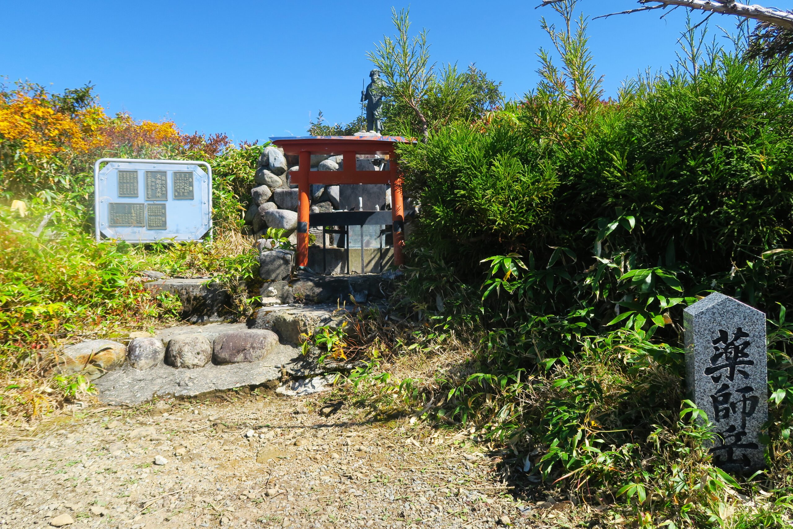 8合目薬師岳山頂(1653.8m)まで鎖場を登りきると、今まではブナを中心として林だったのが低木林に変化し、展望はさらに良くなります。太陽に向かって吠えているような剣を持った猿田彦大神の像が鎮座し、日本書記や古事記に導きの神として登場することからこの先の道中の安全を祈願します。