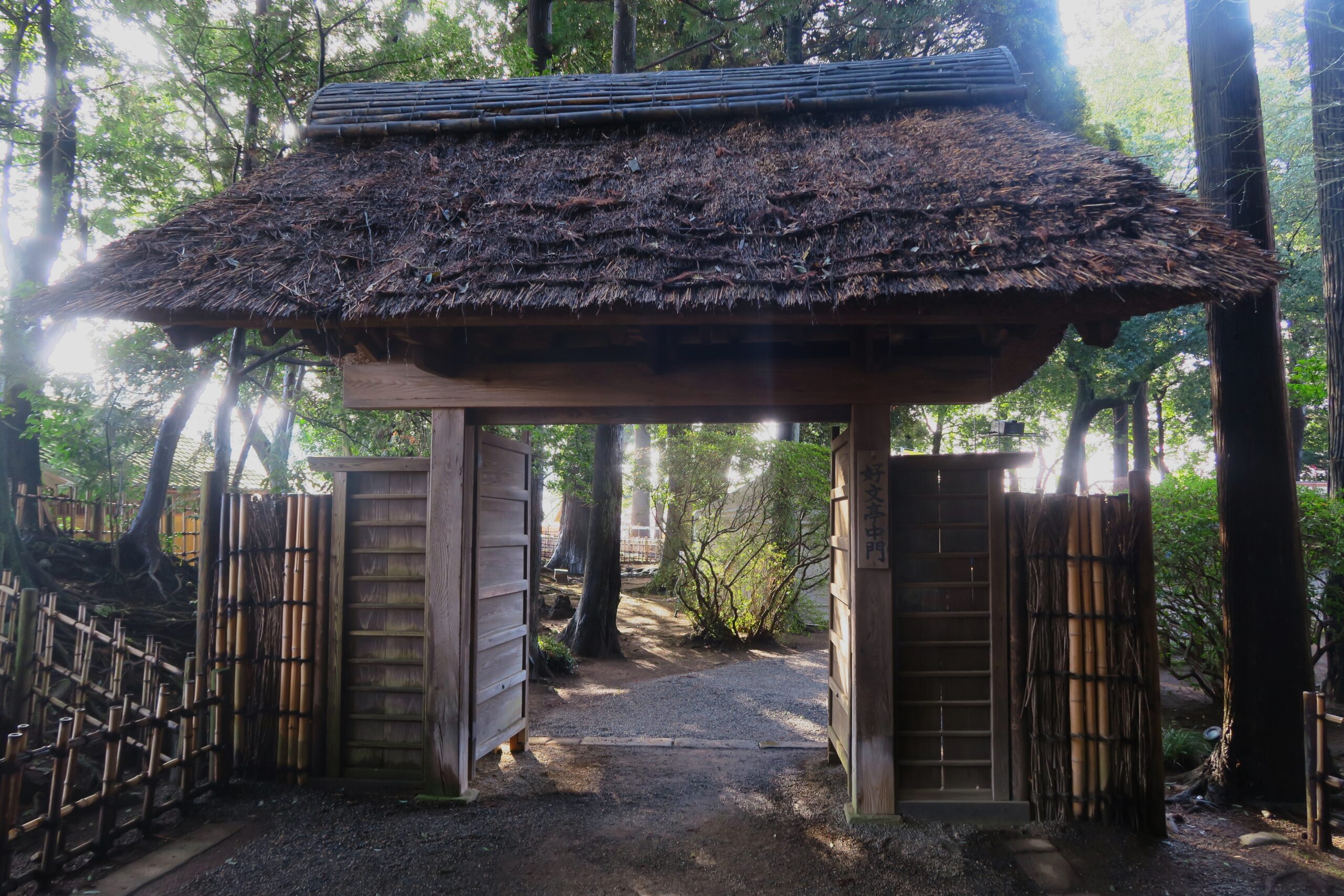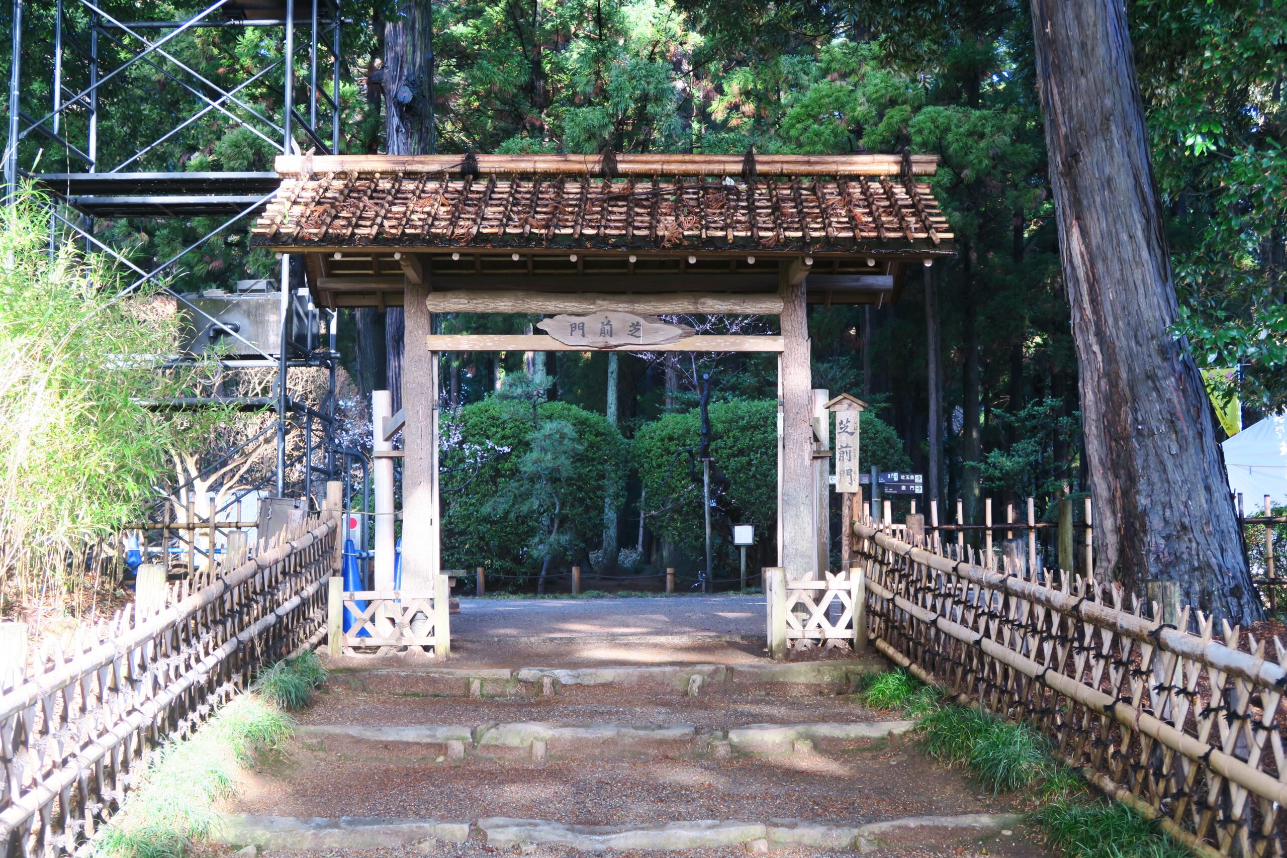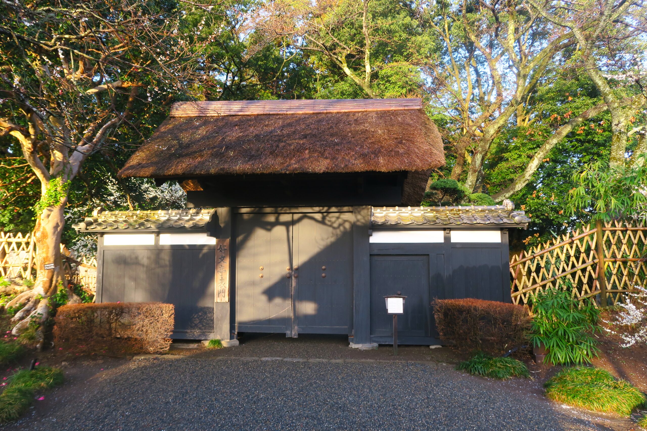 斉昭公自ら構想をを練り、自然の地形を巧みに生かした園内は、相反するものが調和する自然界の理の従い、陰と陽のエリアに設えられています。まずは本来の入口である好文亭表門から入り、孟宗竹林や杉林などを配した「」からめぐりのが本来の回り方。松材が多く用いられ松煙色となっているため、その色味から「黒門」とも呼ばれる表門は、切妻造りの腕木門で屋根は茅葺きになっていて、偕楽園の入口にふさわしい落ち着いた風情を醸し出しています。